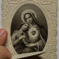 - Description: Elaborately designed votive card with fine embossed printing. Behind the bouquet of flowers a representation of Mary. Accompanied by another female figure, she carries on her chest a flaming heart which has been pierced by a dagger, the sacred heart of Jesus. Votive cards or votive pictures, not infrequently artistically designed, are votive offerings and thus objects that are publicly offered on the basis of a vow or betrothal as a thank-you gift for salvation from hardship, danger, illness and the like. The small-format votive cards usually contain a small devotional picture and are designed with elaborate ornamentation.