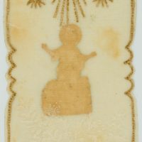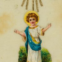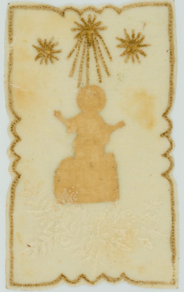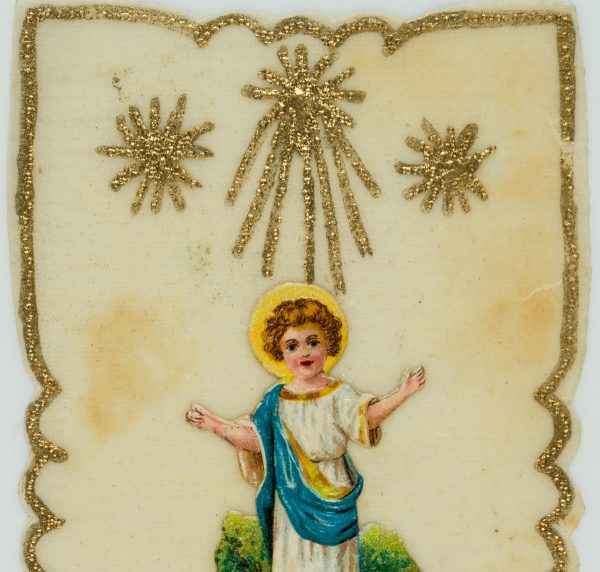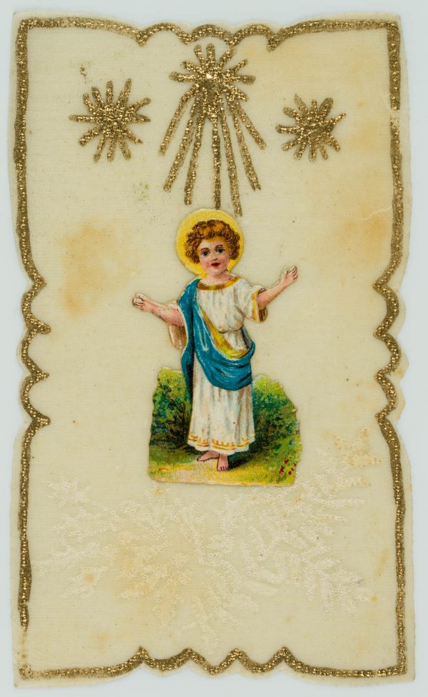 - Beschreibung: Sorgsam gestaltete Votivkarte mit Zierrahmen und floralen Ornamenten. In der Mitte der Jesusknabe mit Nimbus, der von drei Sternen überfangen wird, gleich einem Baldachin. Votivkarten oder Votivbilder, nicht selten kunstfertig gestaltetet, sind Votivgaben und damit Gegenstände, die aufgrund eines Gelübdes bzw. einer Verlobung als Dankesgabe für Errettung aus Not, Gefahr, von Krankheit u.a. öffentlich dargebracht werden. Die kleinformatigen Votivkarten enthalten in den meisten Fällen ein kleines Andachtsbild und sind mit aufwändigem Zierwerk gestaltetet.