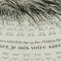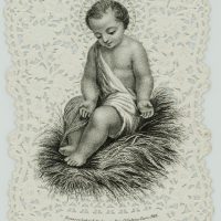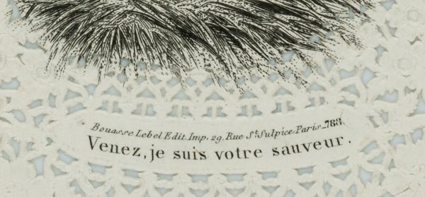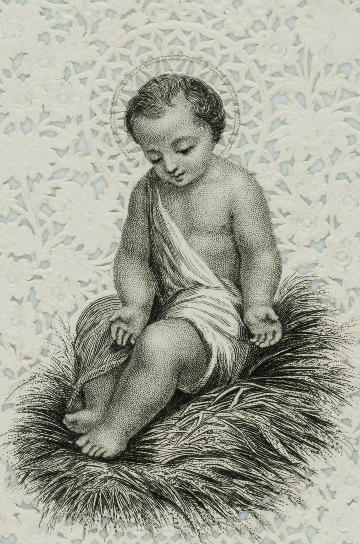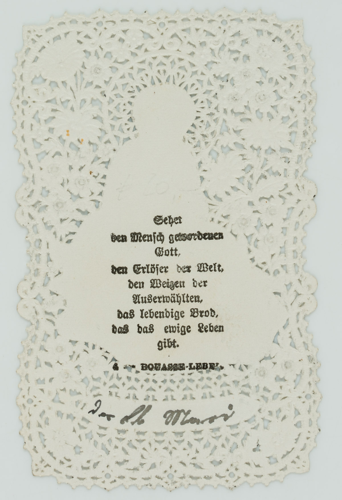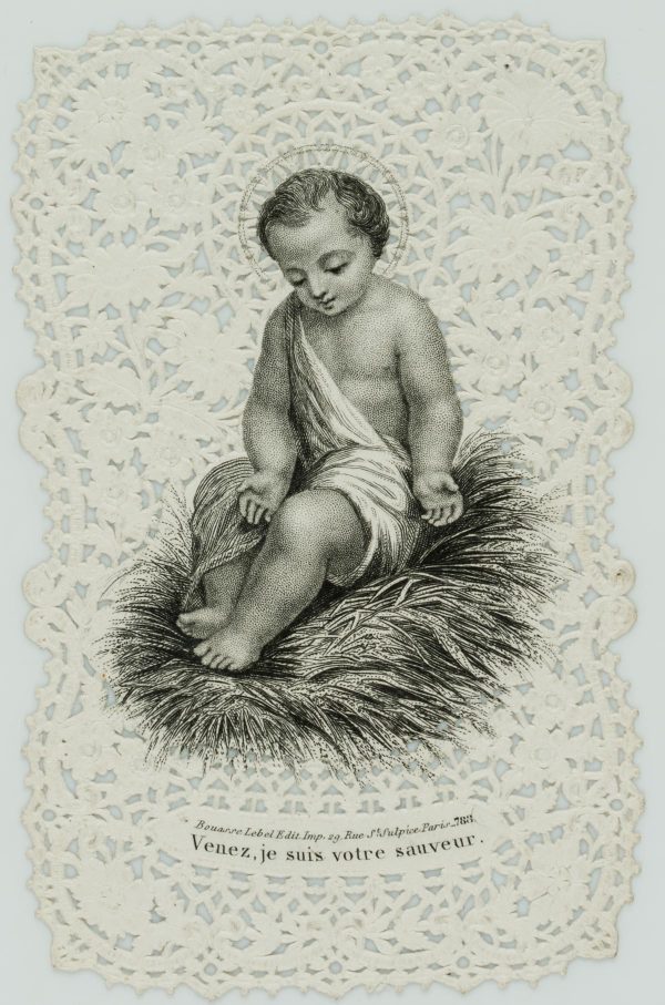 - Description: Elaborately designed votive card with punched and embossed lace frame. In the centre the image of a boy Jesus sitting in the grass, hands open and absorbed in prayer. Below the words “Venez, je suis vortre sauveur.” On the reverse, a prayer. Votive cards or votive pictures, not infrequently artistically designed t, are votive offerings and thus objects that are offered publicly on the basis of a vow or betrothal as a thank-you gift for salvation from hardship, danger, illness, etc. The small-format votive cards usually contain a small devotional picture and are designed with elaborate ornamentation.