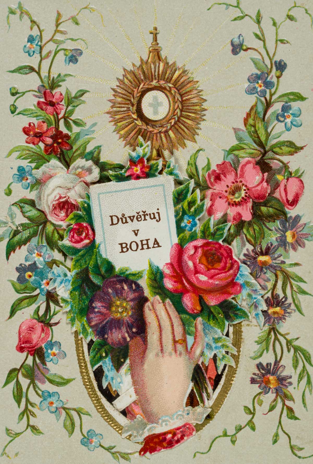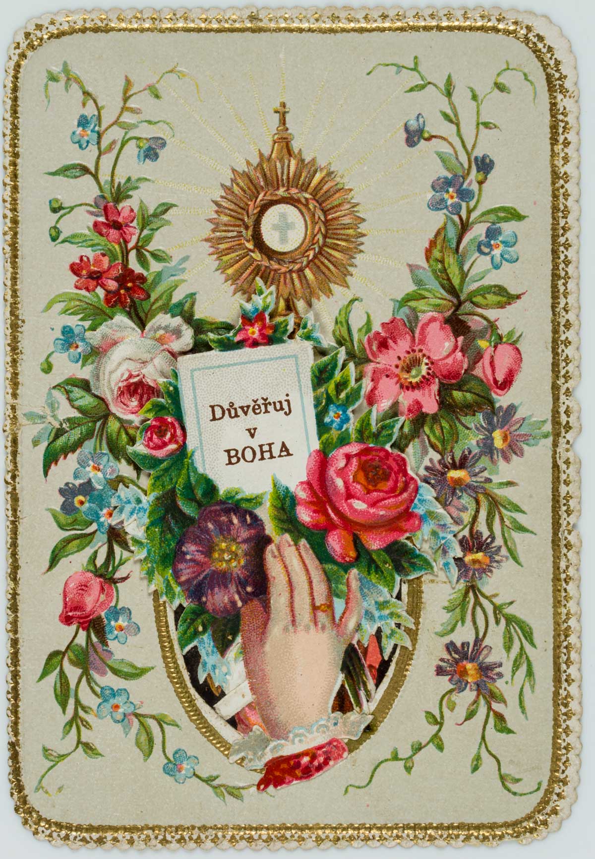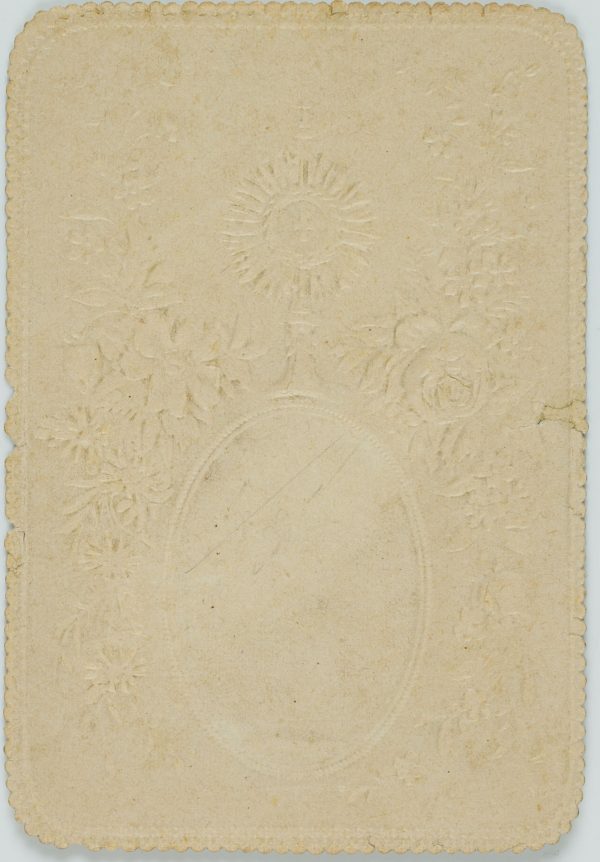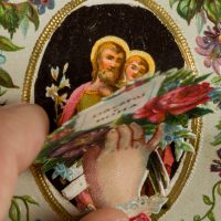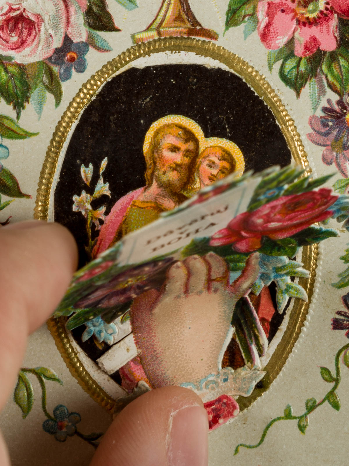 - Description: Elaborately designed votive card with floral vine work and embossed decorative frame. Under the cover a depiction of Joseph with the infant Jesus in his arms. In his right hand he holds a white lily. Votive cards or votive pictures, not infrequently artistically designed, are votive offerings and thus objects that are publicly offered on the basis of a vow or betrothal as a thank-you gift for salvation from hardship, danger, illness, etc. The small-format votive cards usually contain a small devotional picture and are designed with elaborate ornamentation. For further classification, see also Adolf Spamer: Das kleine Andachstbild vom XIV. bis zum XX. Jahrhundert.