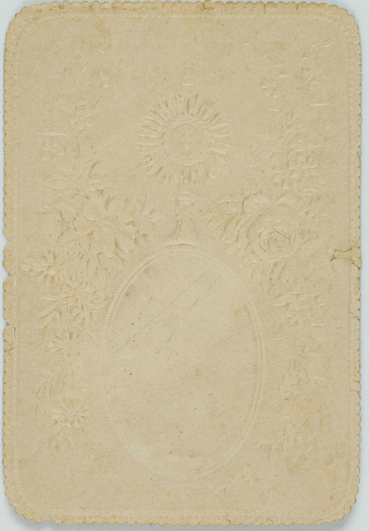 - Beschreibung: Aufwändig gestaltete Votivkarte mit floralem Rankwerk und geprägtem Zierrahmen. Unter der Abdeckung eine Darstellung Josefs mit dem Jesuskind in seinem Arm. In seiner rechten hält er eine weiße Lilie. Votivkarten oder Votivbilder, nicht selten kunstfertig gestaltet, sind Votivgaben und damit Gegenstände, die aufgrund eines Gelübdes bzw. einer Verlobung als Dankesgabe für Errettung aus Not, Gefahr, von Krankheit u.a. öffentlich dargebracht werden. Die kleinformatigen Votivkarten enthalten in den meisten Fällen ein kleines Andachtsbild und sind mit aufwändigem Zierwerk gestaltet.Zur weiteren Einordnung siehe auch Adolf Spamer: Das kleine Andachstbild vom XIV. bis zum XX. Jahrhundert.