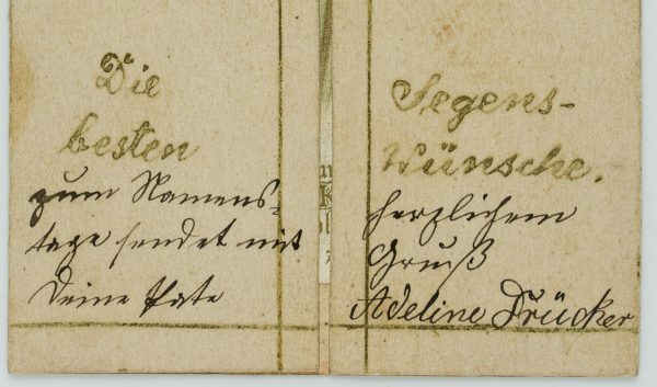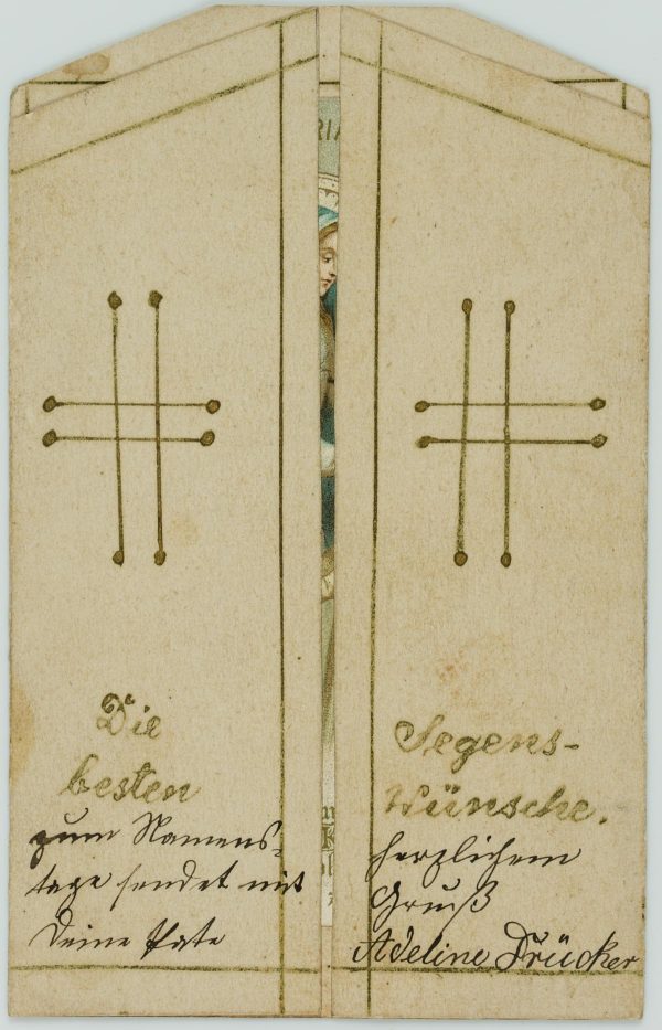 - Beschreibung: Sorgsam gestaltete Votivkarte zum aufklappen. Im Inneren eine Darstellung Mariens, dort zu lesen “Maria unsere Mutter./Maria betrachtet uns als ihre besonderen Kinder, wenn wir ihrem Sohne möglichst ähnlich zu werden suchen.” Votivkarten oder Votivbilder, nicht selten kunstfertig gestaltet, sind Votivgaben und damit Gegenstände, die aufgrund eines Gelübdes bzw. einer Verlobung als Dankesgabe für Errettung aus Not, Gefahr, von Krankheit u.a. öffentlich dargebracht werden. Die kleinformatigen Votivkarten enthalten in den meisten Fällen ein kleines Andachtsbild und sind mit aufwändigem Zierwerk gestaltet.