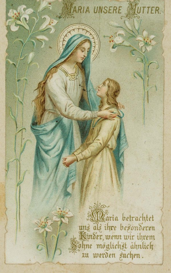 - Description: Carefully designed votive card to open. Inside a depiction of Mary, there to read “Mary our Mother/Mary regards us as her special children if we seek to become as like her Son as possible”. Votive cards or votive pictures, not infrequently artistically designed, are votive offerings and thus objects that are publicly offered on the basis of a vow or betrothal as a thank-you gift for salvation from hardship, danger, illness and the like. The small-format votive cards usually contain a small devotional picture and are designed with elaborate ornamentation.