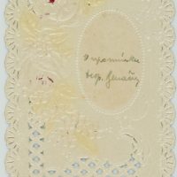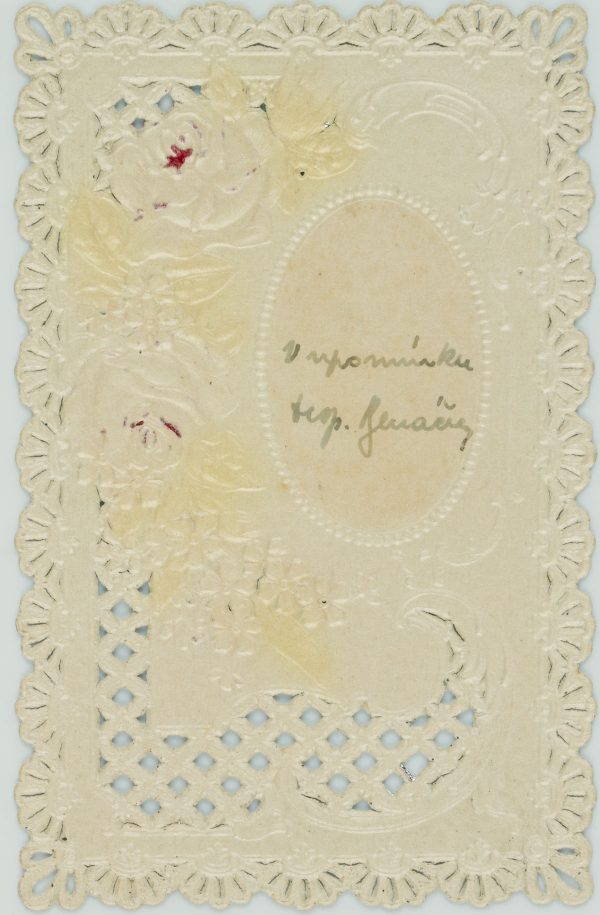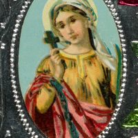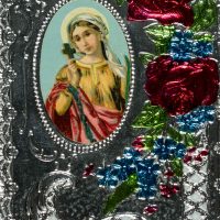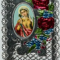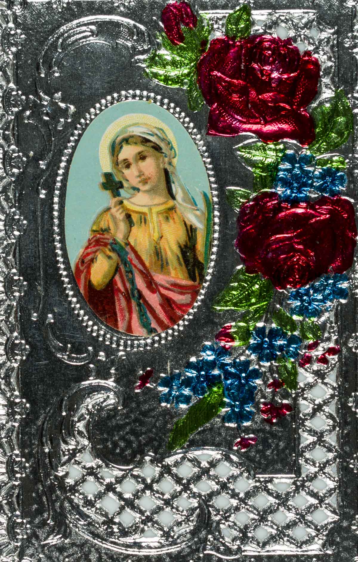 - Inscription: On the left, a depiction of Mary with cross and nimbus, surrounded by roses and other flowers. On the reverse a handwritten note.