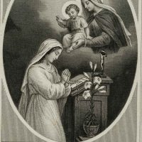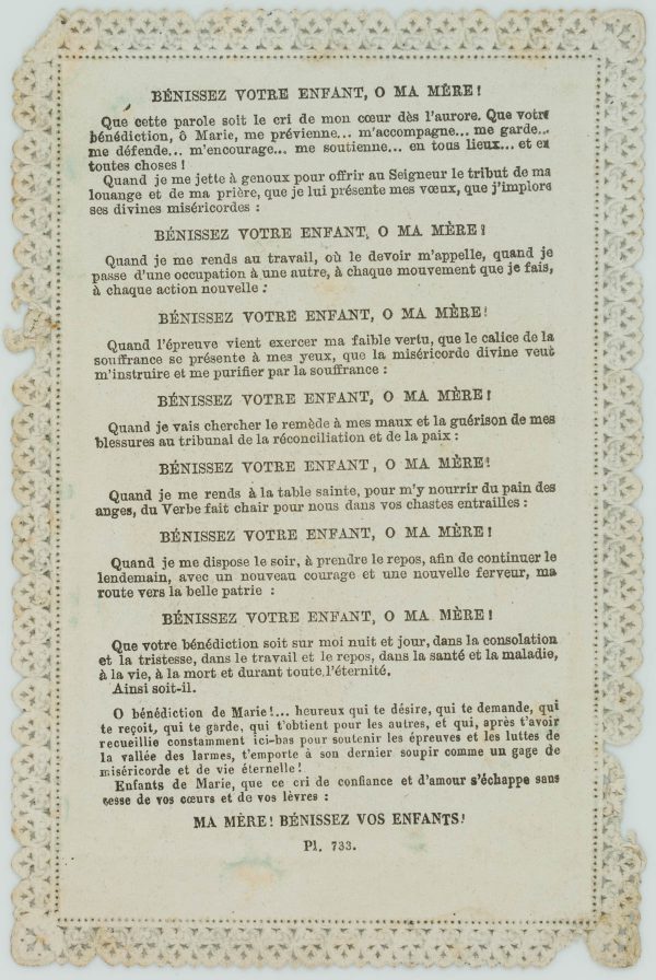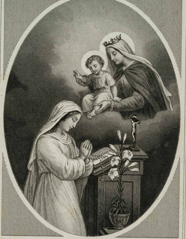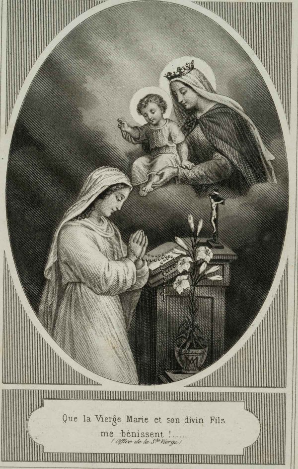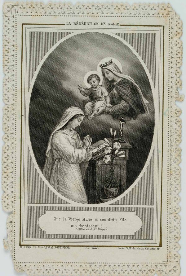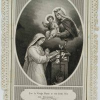 - Description: Carefully designed votive card with embossed and punched decorative frame. In the centre the depiction of the blessing by Mary. At a small altar a woman has folded her hands in prayer. Above her appears Mary with the Child Jesus, who has raised his right arm in a gesture of blessing. Votive cards or votive pictures, not infrequently artistically designed, are votive offerings and thus objects that are publicly offered on the basis of a vow or betrothal as a thank-you gift for salvation from hardship, danger, illness, etc. The small-format votive cards usually contain a small devotional picture and are designed with elaborate ornamentation.