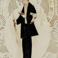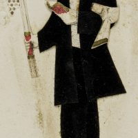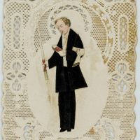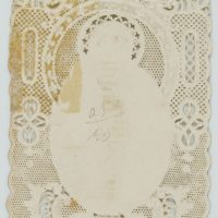- Description: Carefully designed votive card with embossed and punched vine work. In the centre is a depiction of a male figure who appears to be holding a Bible in his left hand and possibly a communion candle in his right. Votive cards or votive pictures, not infrequently artistically designed, are votive offerings and thus objects that are publicly offered on the basis of a vow or a betrothal as a thank-you gift for salvation from distress, danger, illness and the like. The small-format votive cards usually contain a small devotional picture and are designed with elaborate ornamentation.