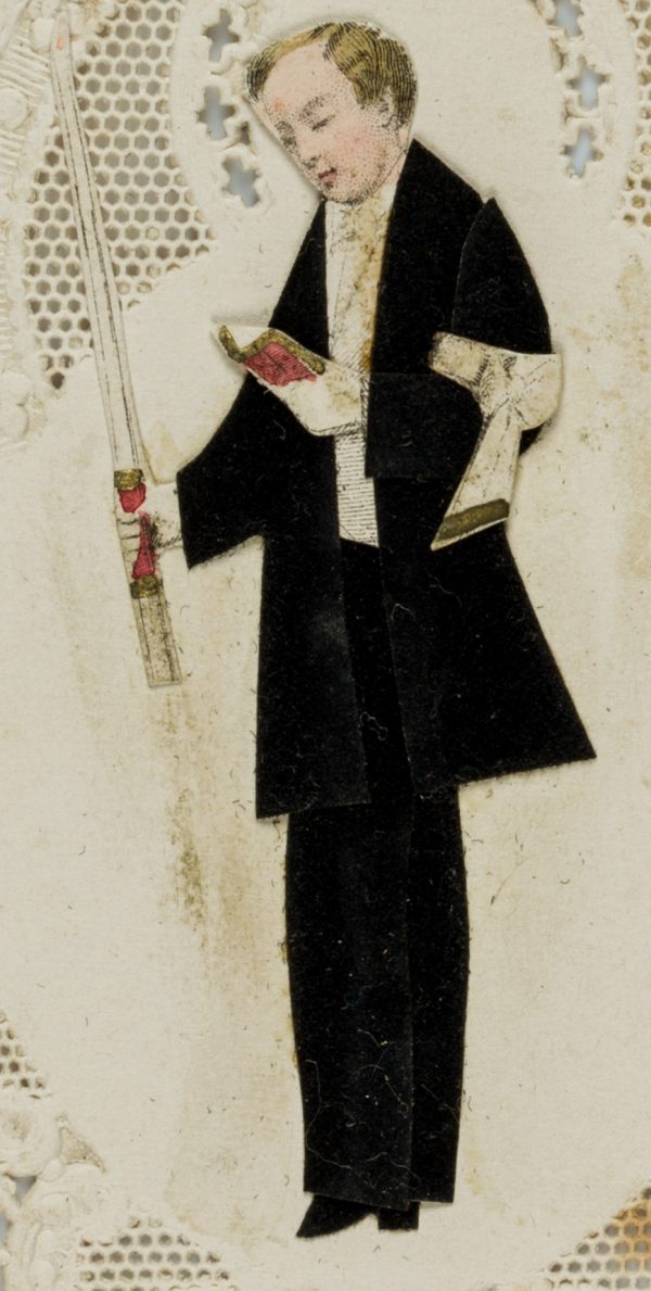 - Beschreibung: Sorgsam gestaltete Votivkarte mit geprägtem und gestanztem Rankwerk. In der Mitte die Darstellung einer männlichen Figur, die in der Linken eine Bibel zu halten scheint und in der Rechten womöglich eine Kommunionskerze. Votivkarten oder Votivbilder, nicht selten kunstfertig gestaltet, sind Votivgaben und damit Gegenstände, die aufgrund eines Gelübdes bzw. einer Verlobung als Dankesgabe für Errettung aus Not, Gefahr, von Krankheit u.a. öffentlich dargebracht werden. Die kleinformatigen Votivkarten enthalten in den meisten Fällen ein kleines Andachtsbild und sind mit aufwändigem Zierwerk gestaltet.