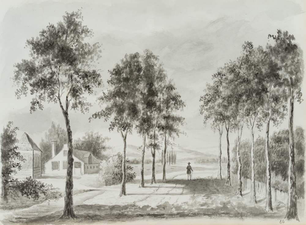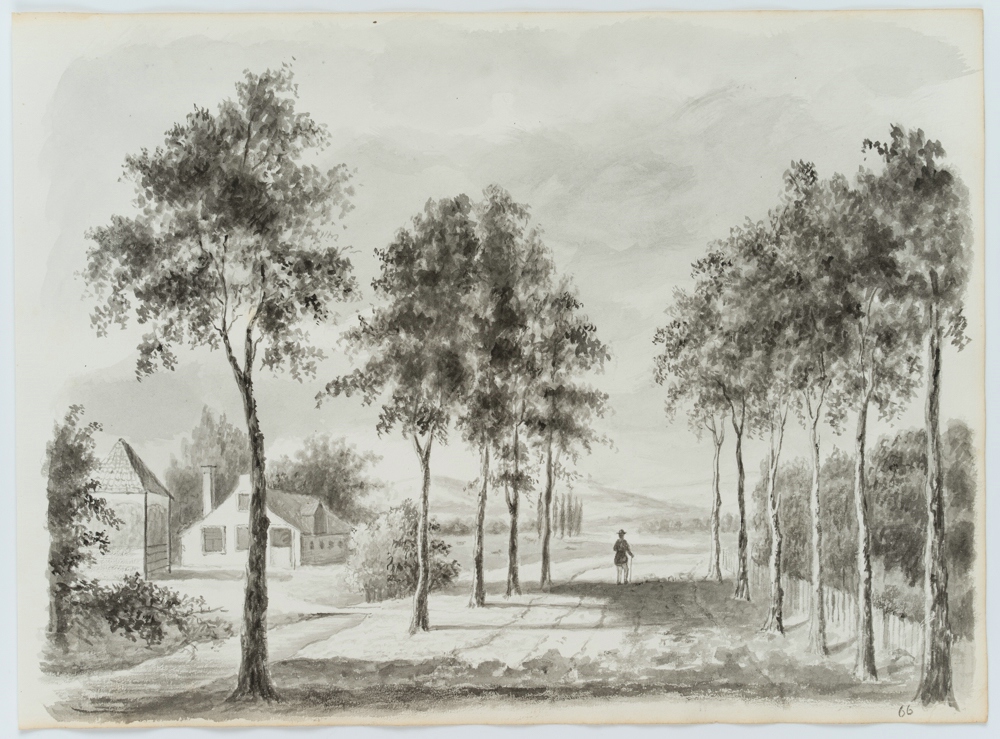 - Description: Beautiful landscape painting with a view along an avenue road with young trees to a gentle hilly landscape. A lonely hiker is walking along the road, his silhouette standing out effectively against the light background. This depiction is particularly captivating because of the small-scale depiction of nature, for example in the foliage of the trees. The work comes from the sketchbook of an unknown French artist who travelled in the Netherlands, Belgium, northern Germany and the Rhine region in the mid-19th century, capturing in particular Dutch, Flemish and northern German landscapes. In doing so, he shows the everyday life of the inhabitants along the large and small rivers as well as glimpses of cityscapes in the North Sea region.