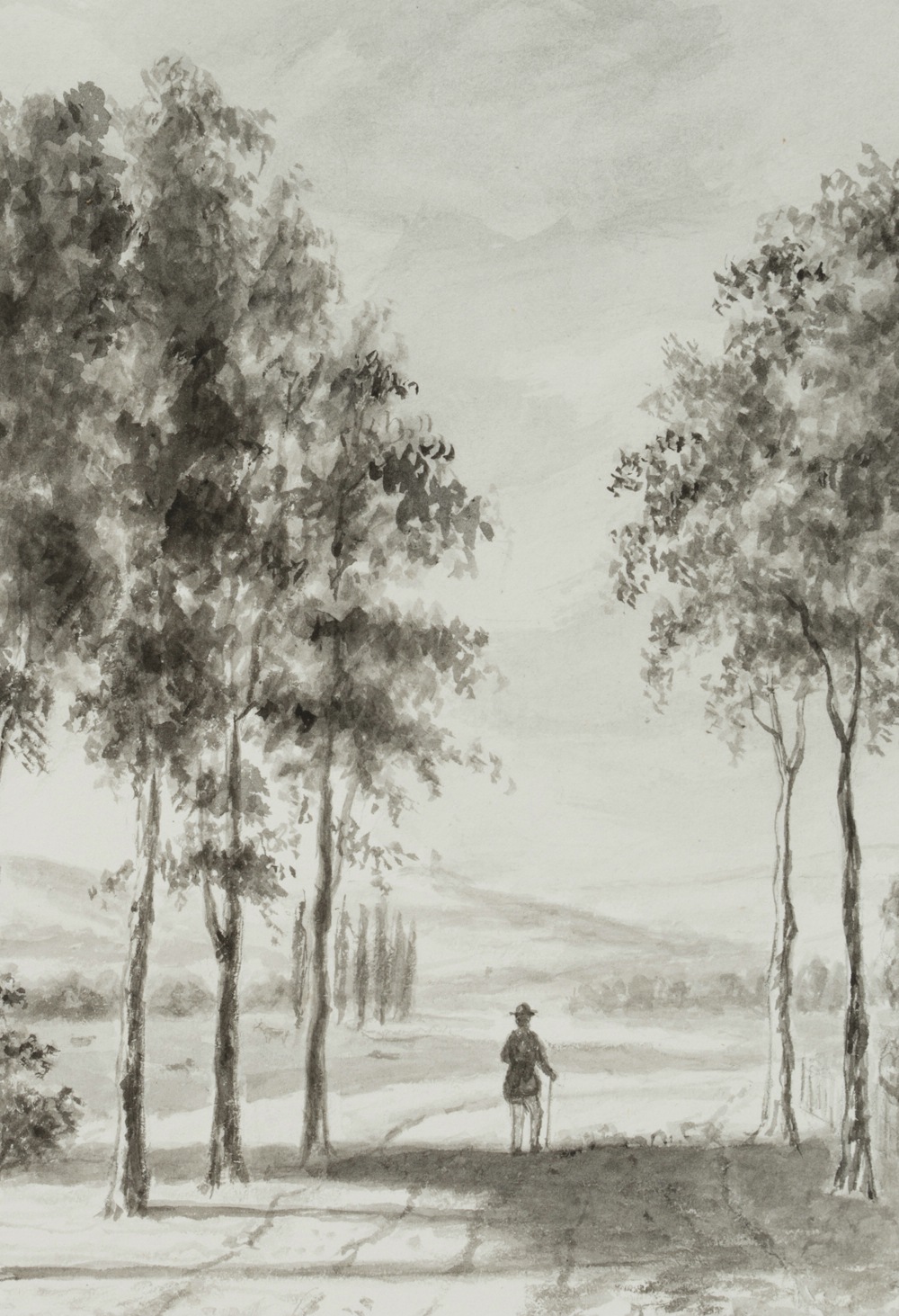 Unbekannt (19. Jahrhundert), Wanderer auf Allee im Rheinland, 19. Jahrhundert, Pinselzeichnung