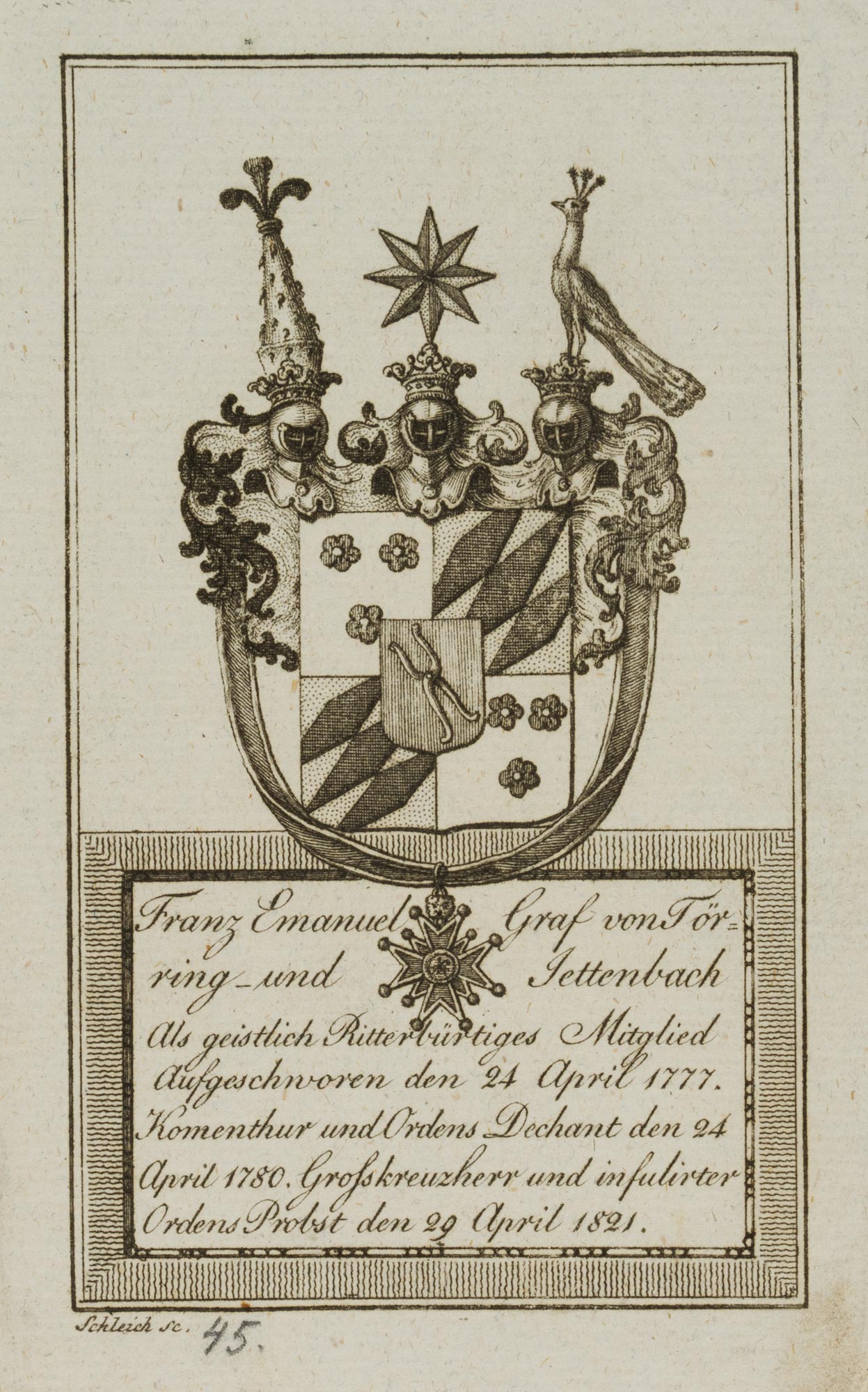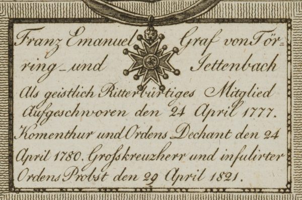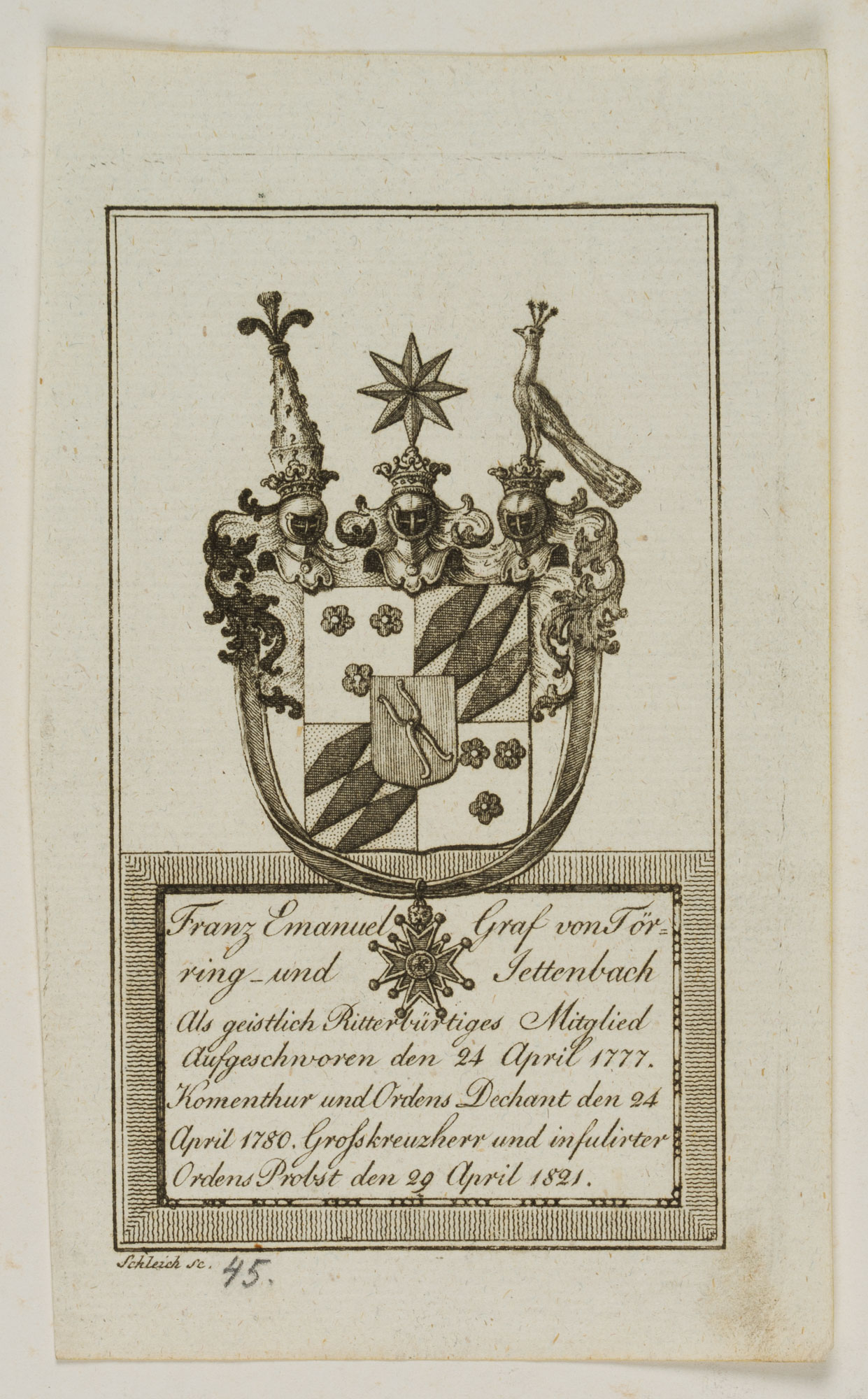 Original copper engraving coat of arms, legend below: “Franz Emanuel Graf von Törring und Jttenbach as a clerical knight member sworn in on 24 April 1777..Großkreuzherr und infulirter Ordens Probst den 29. April 1821”. | Watermark: three circles - Keywords: 19th century, Historicism, Military, Germany,