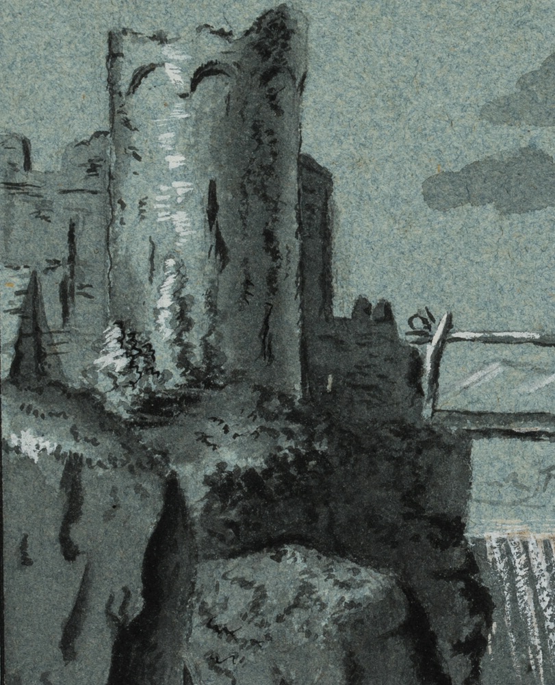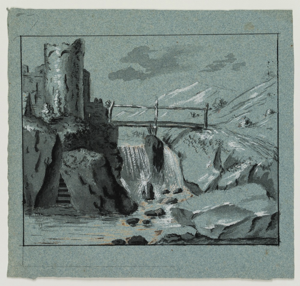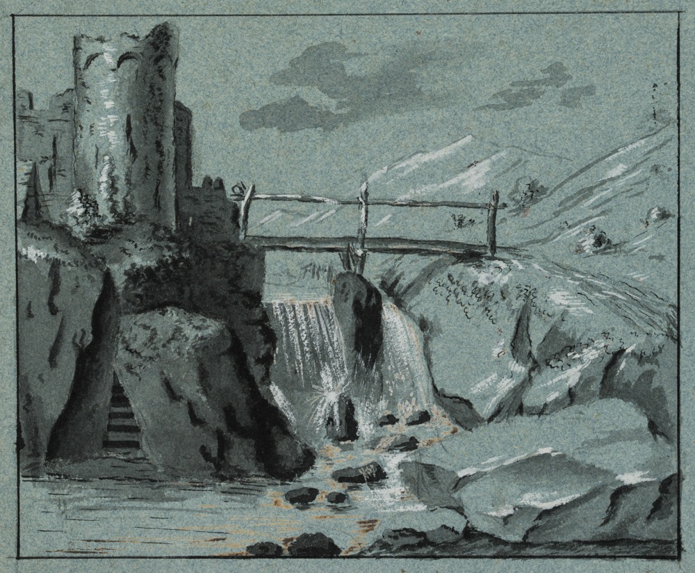 Unknown (19th century), Waterfall at romantic castle ruin, c. 1800, Brush drawing