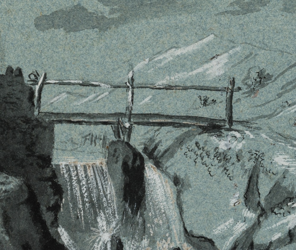 - Beschreibung: Gelungenes Studienblatt an der romantischen Ruine einer gotischen Burg, die inmitten eines Flusses steht. Über einen angrenzenden Wasserfall führt ein schmaler Steg, der die Burg auf ihrem Felskegel mit dem Ufer und der Hügellandschaft verbindet.