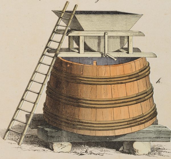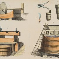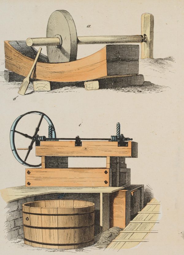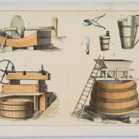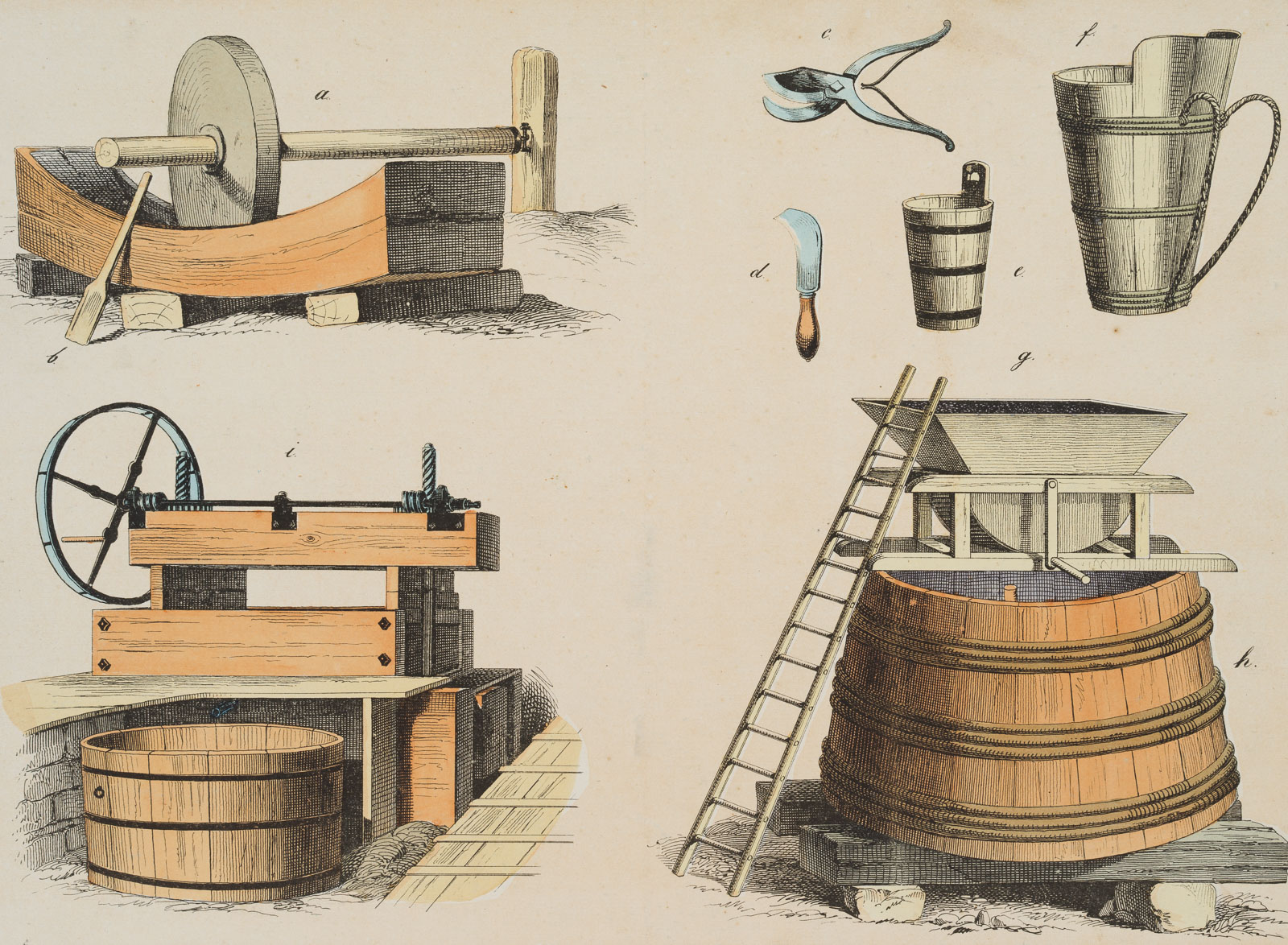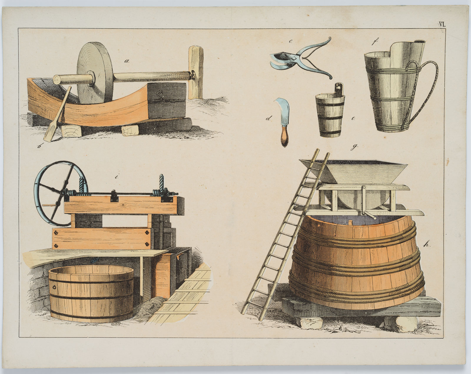 Unbekannt (19. Jahrhundert), Wein und Saftpressen und weitere Hilfsmittel: Körbe, Schere, Messer. Anschauungsblätter einer Enzyklopädie, um 1900, Federlithographie