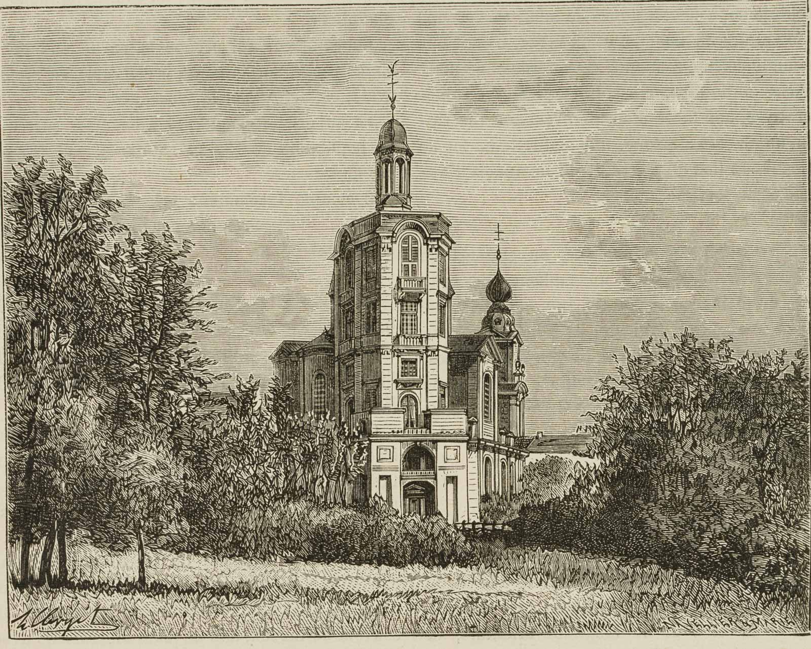 Unknown (19th century), View from a green meadow to the west façade of the Jesuit Church in Mannheim, Baden Württemberg, 19th century, Steel engraving