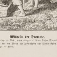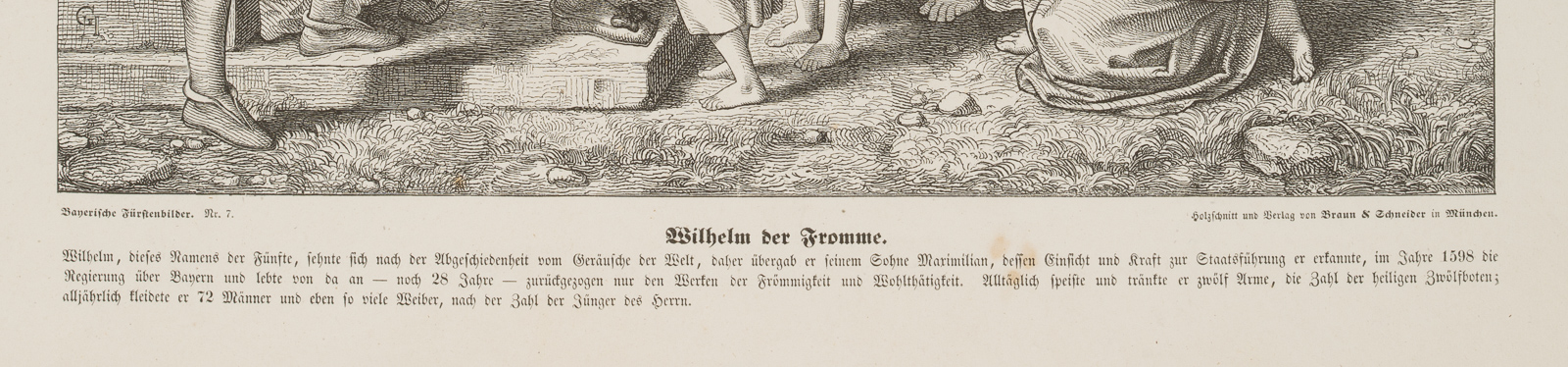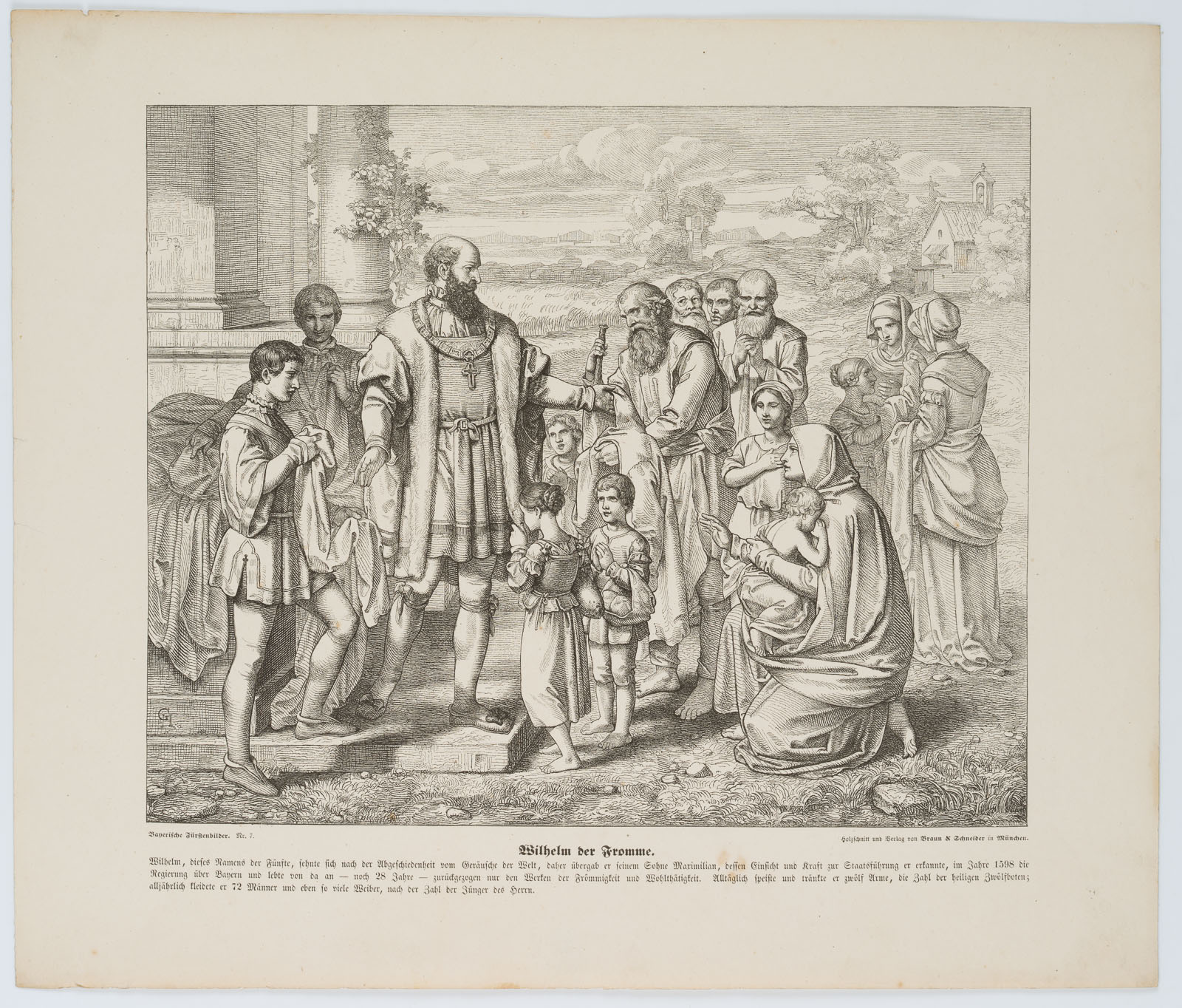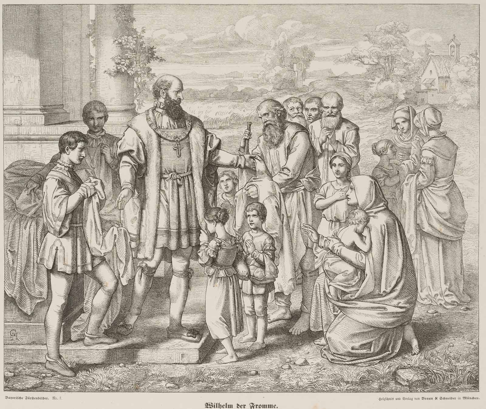 Unbekannt (19. Jahrhundert), Darstellung des Wilhelm dem Frommen (1548 in Landshut – 1626 in Schleißheim), Herzog von Bayern, beim Speisen und Tränken der Armen, aus der Reihe: Bayerische Fürstenbilder Nr. 7, 19. Jahrhundert, Holzstich
