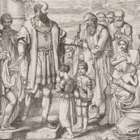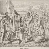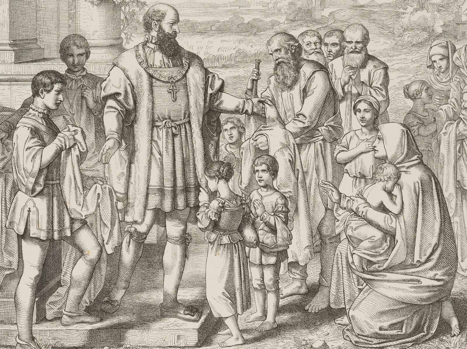 Unknown (19th century), Depiction of William the Pious (1548 in Landshut – 1626 in Schleißheim), Duke of Bavaria, feeding and watering the poor, from the series: Bavarian Princes’ Paintings No 7, 19th century, Wood engraving
