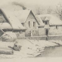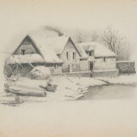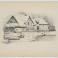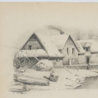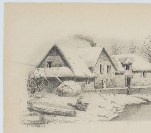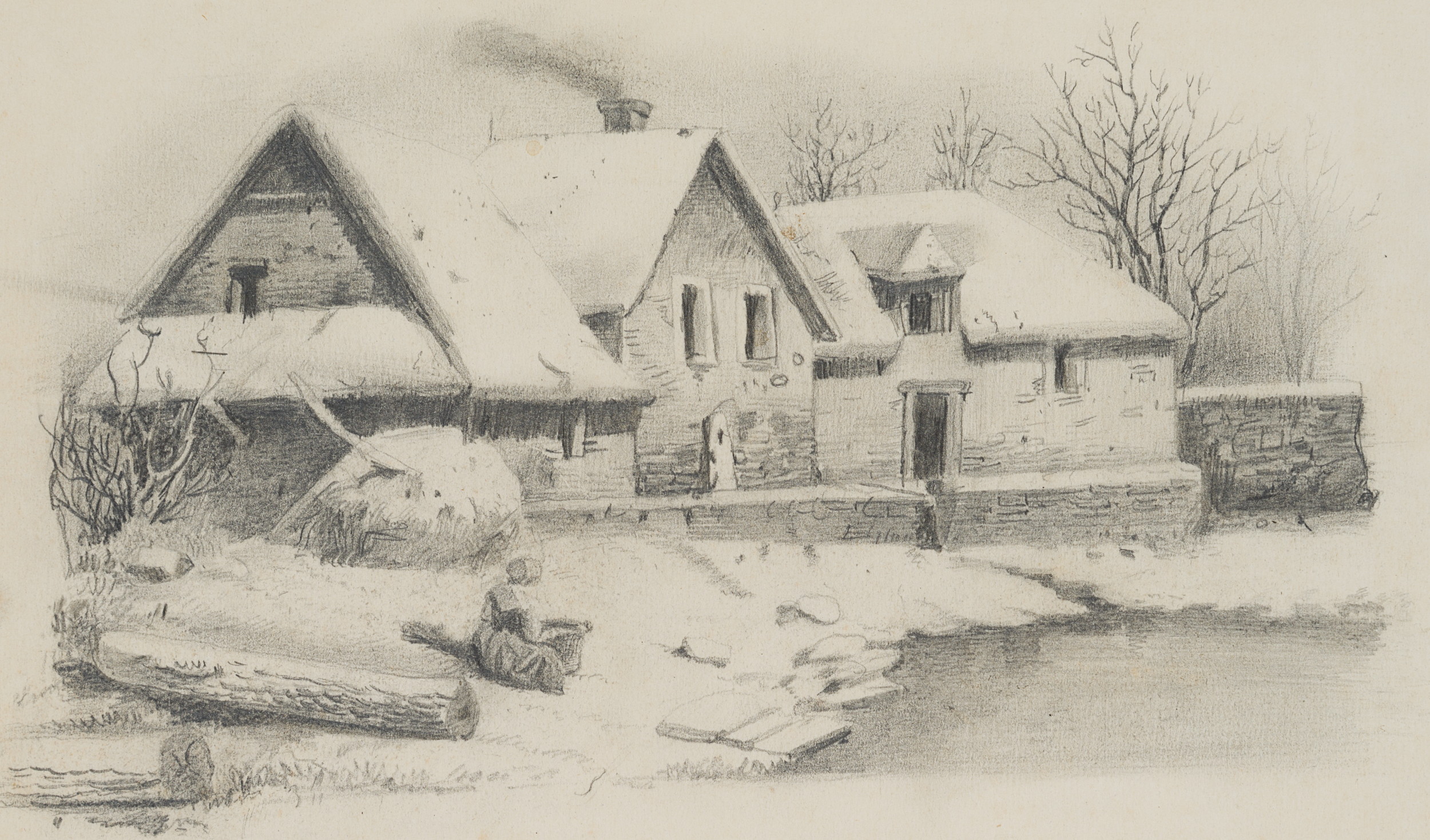 - Description: Drawing of a homestead by a body of water in a winter landscape covered with snow from a friendship album from around 1860.