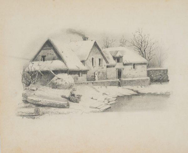 Unbekannt (19. Jahrhundert), Winterliches Gehöft am Wasser, um 1860, Bleistift