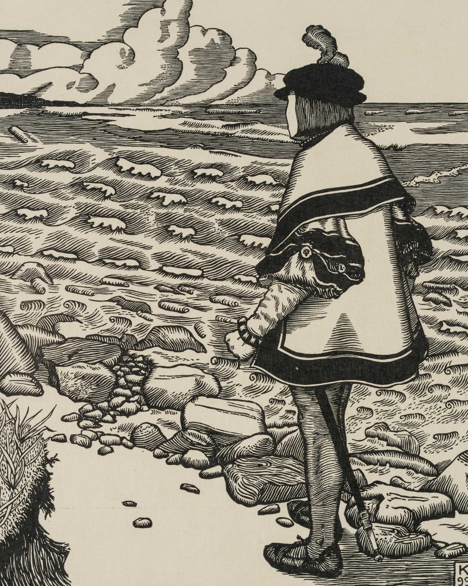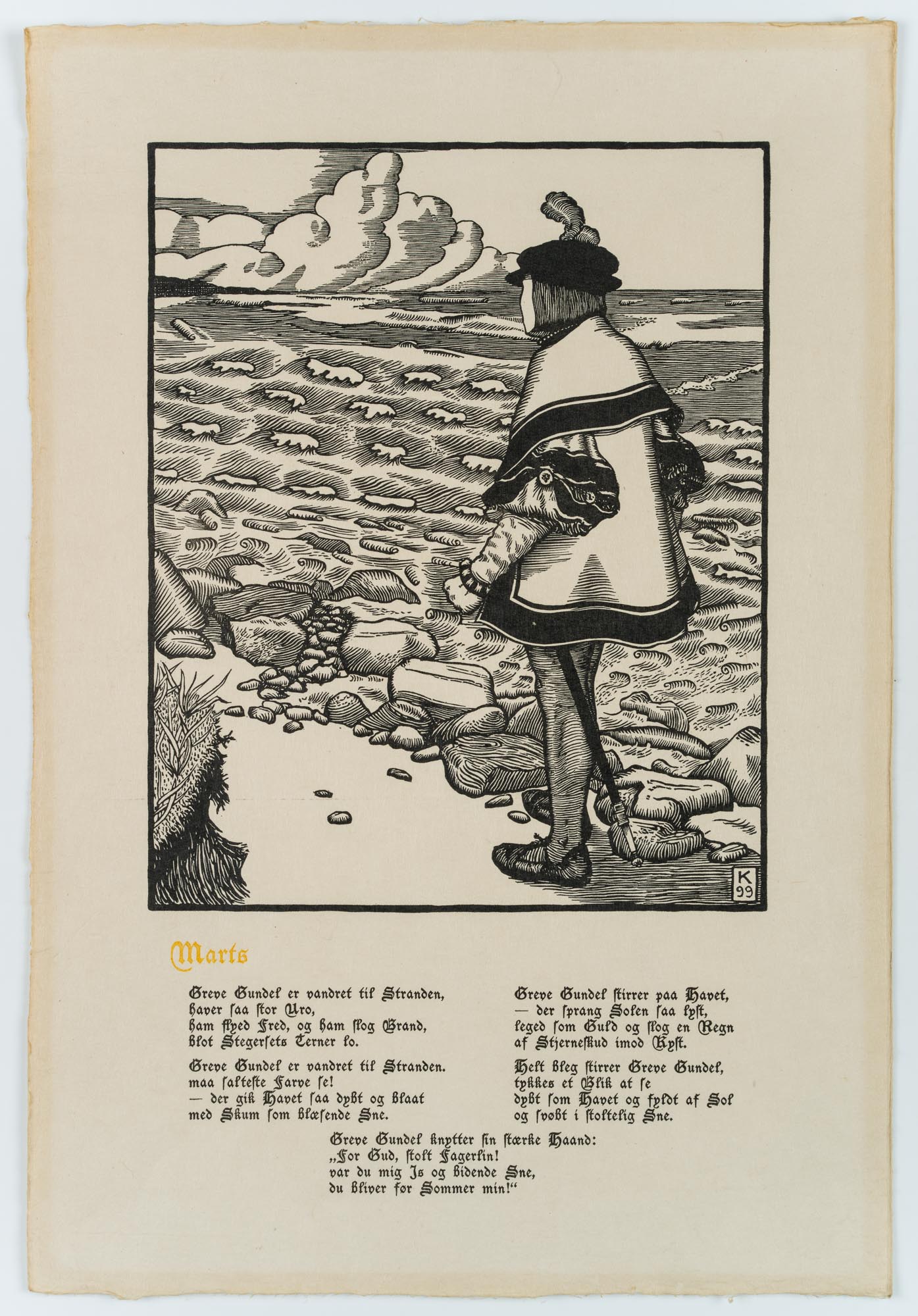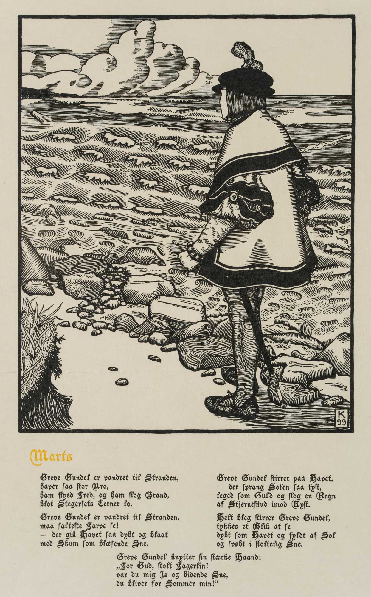 - Beschreibung: Die Illustration zum dänischen Gedicht Marts (März) von Viggo Stuckenberg (1863-1905) zeigt den Grafen Gundel als Rückenfigur am Strand, der sinnend das Meer betrachtet.