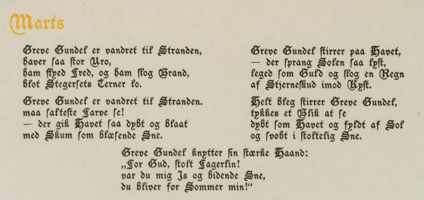- Description: The illustration for the Danish poem Marts (March) by Viggo Stuckenberg (1863-1905) shows Count Gundel as a figure on his back on the beach, contemplating the sea.