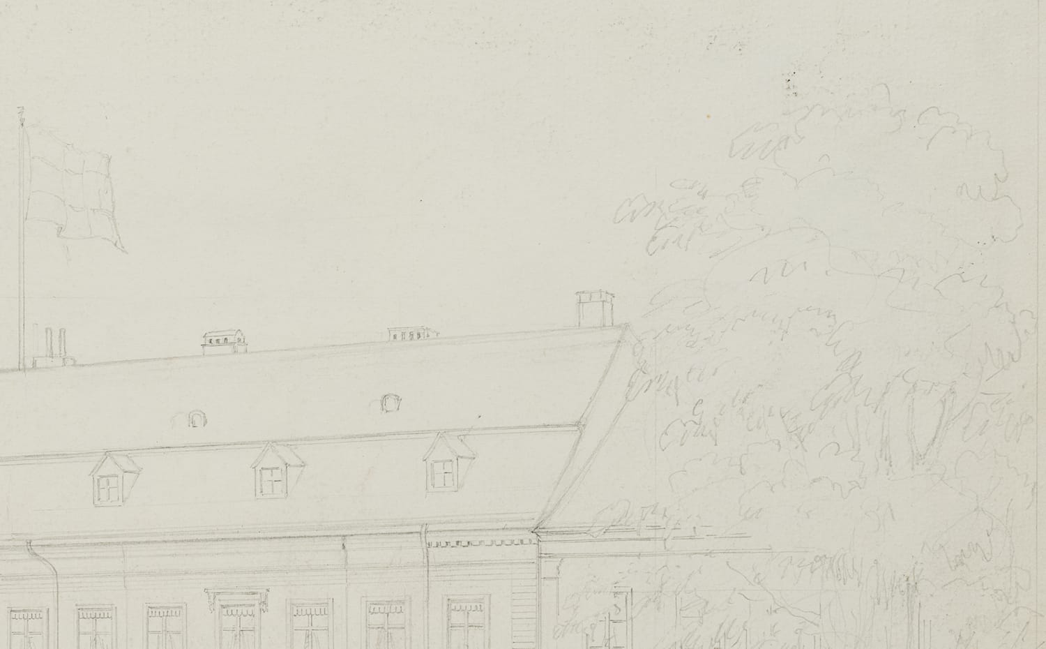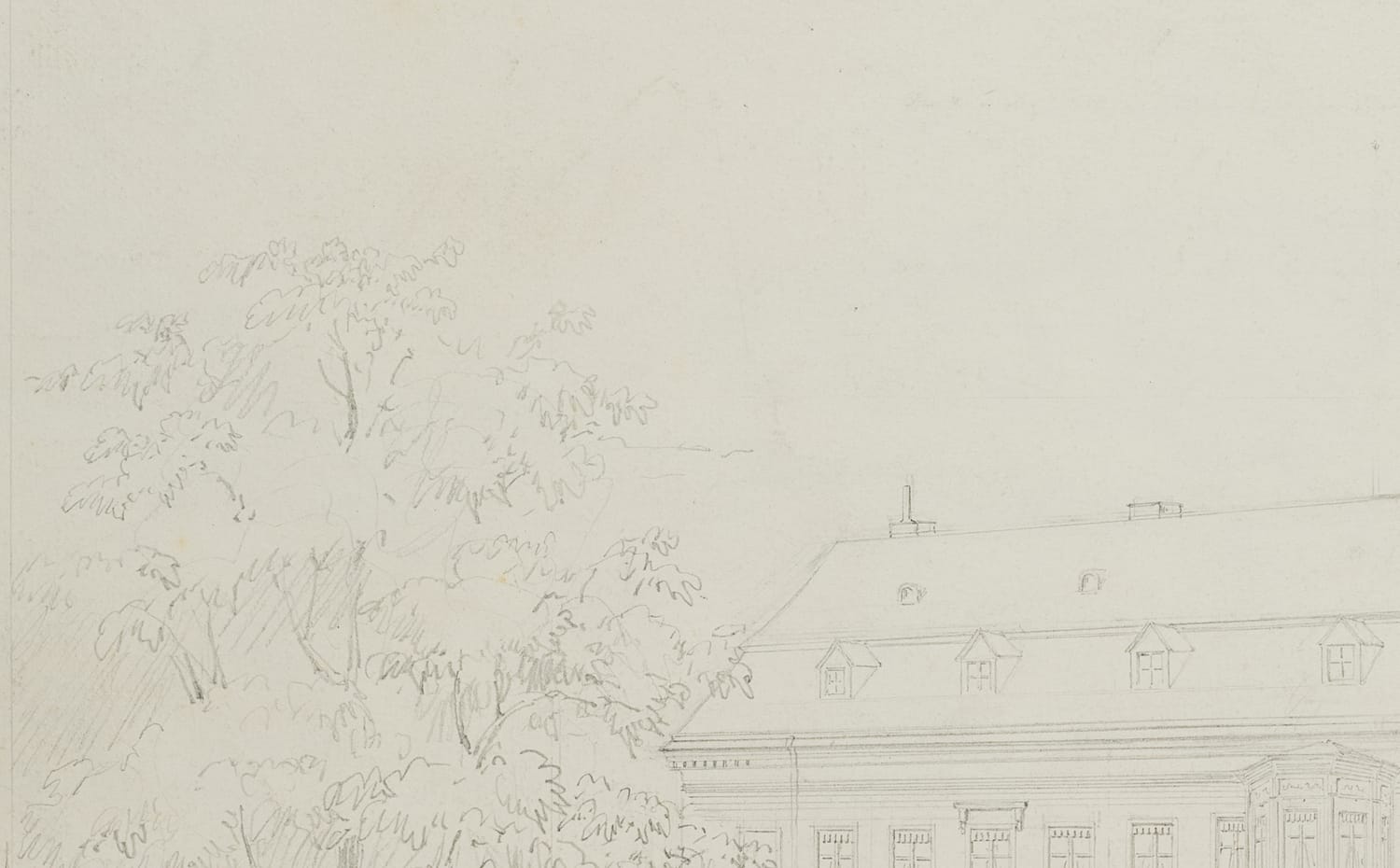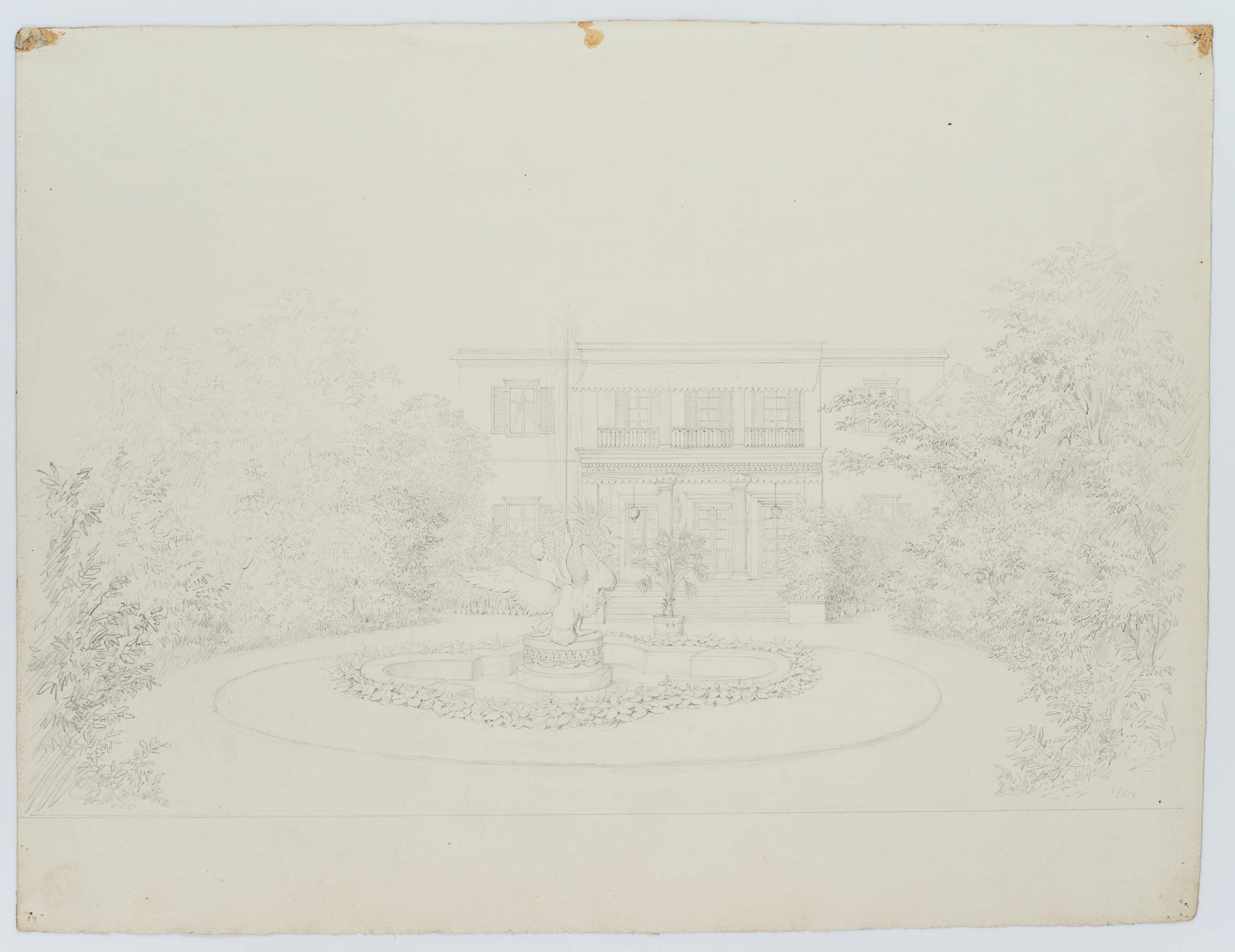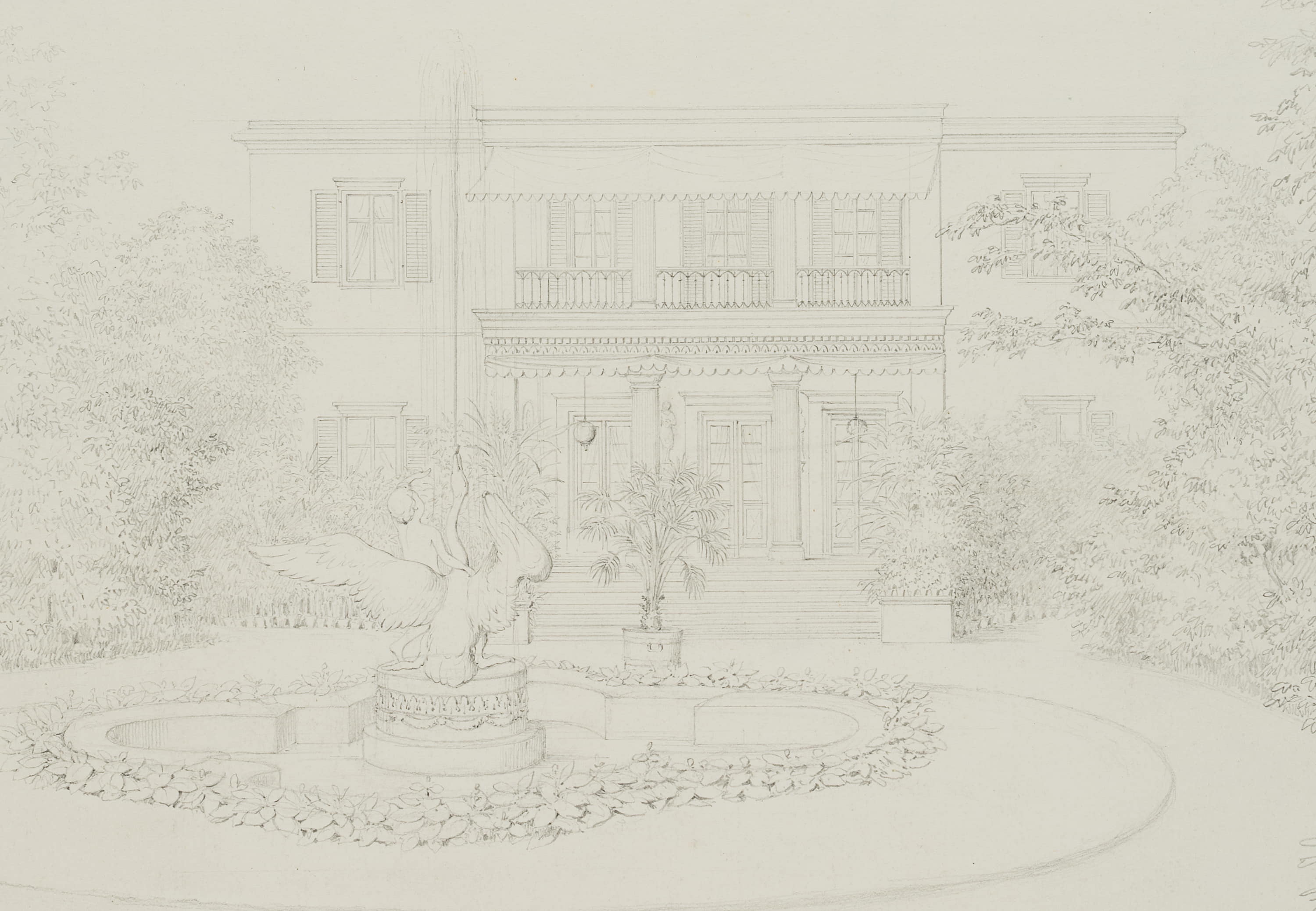 Der Künstler, der nach der Mitte des 19. Jahrhunderts in Berlin und seinem Umland aktiv war, zeichnete vor allem Architekturansichten und deren direkte Einbindung in Stadt- und Parklandschaften. So ist auch auf der Rückseite dieses Blattes die Ansicht einer weiteren Villa gezeigt, die aber im Gegensatz zur Vorderseite wohl eher als Rückzugsort auf dem Lande zu vermuten ist. Das kleine Gebäude mit klassizistischem Portikus ist umgeben von Büschen und Bäumen, auf dem Vorplatz fällt ein aufwendiger Brunnen mit großer Schwanenfigur und einem Kind auf. - Verso: Ansicht einer Villa mit Schwanenbrunnen