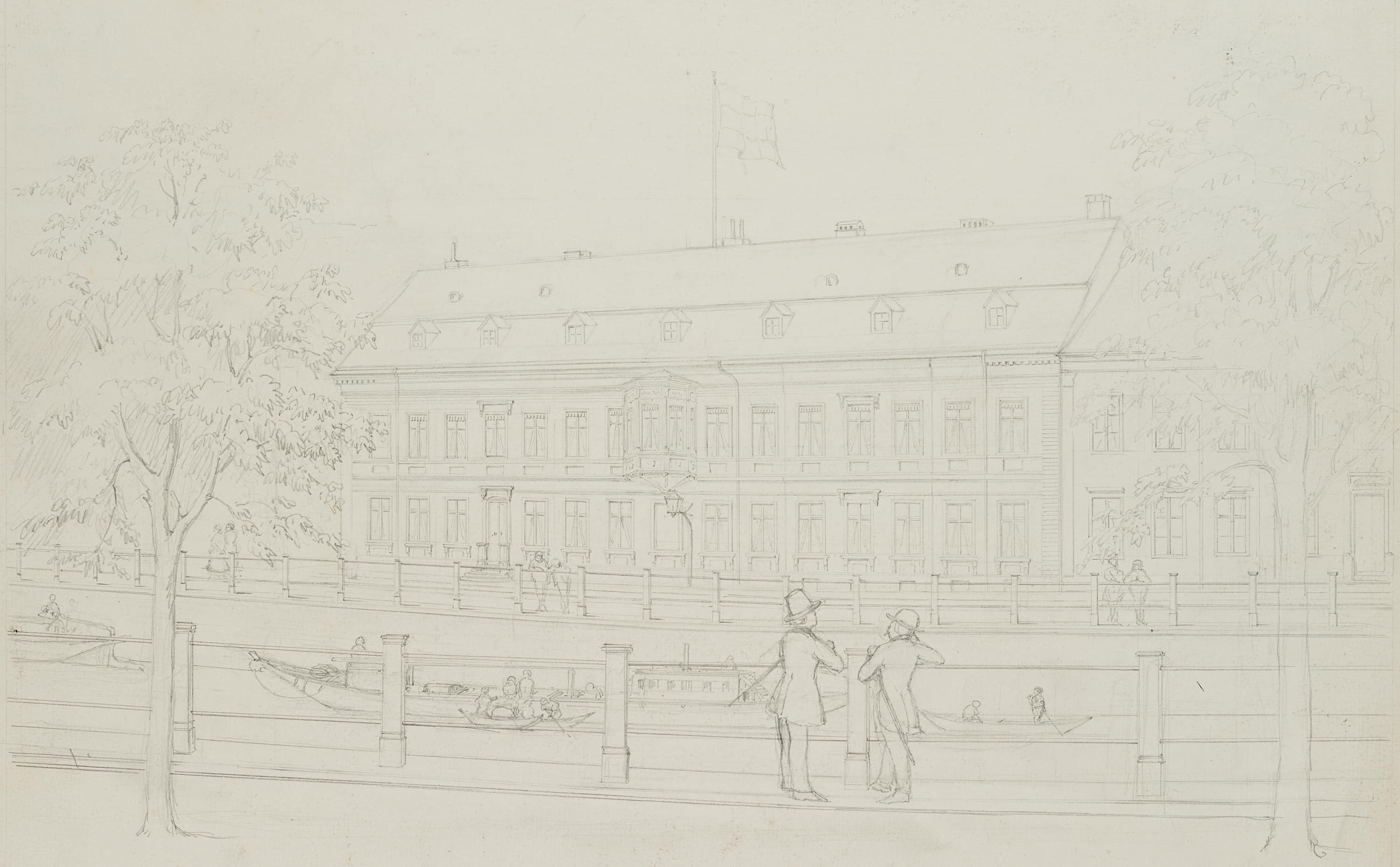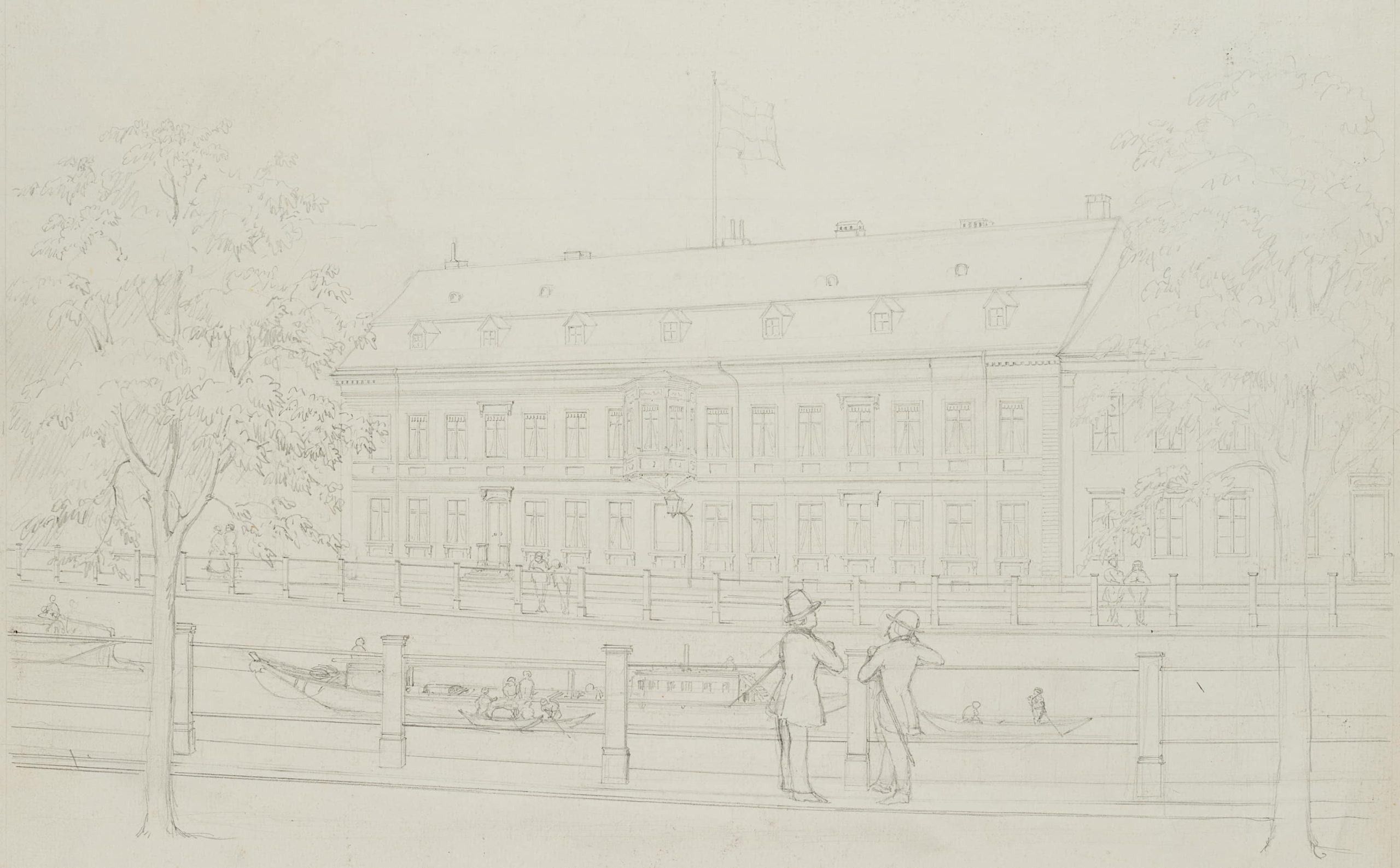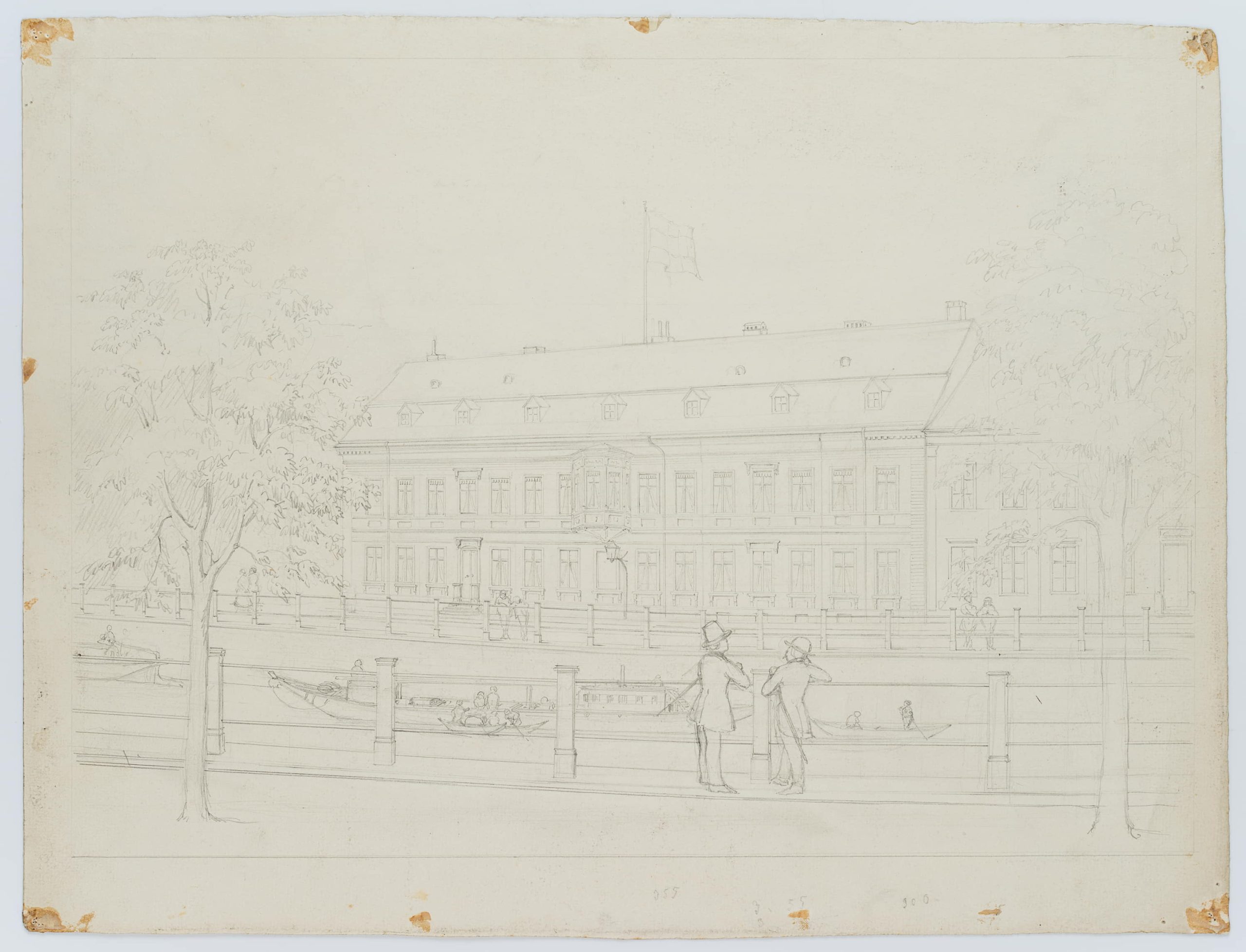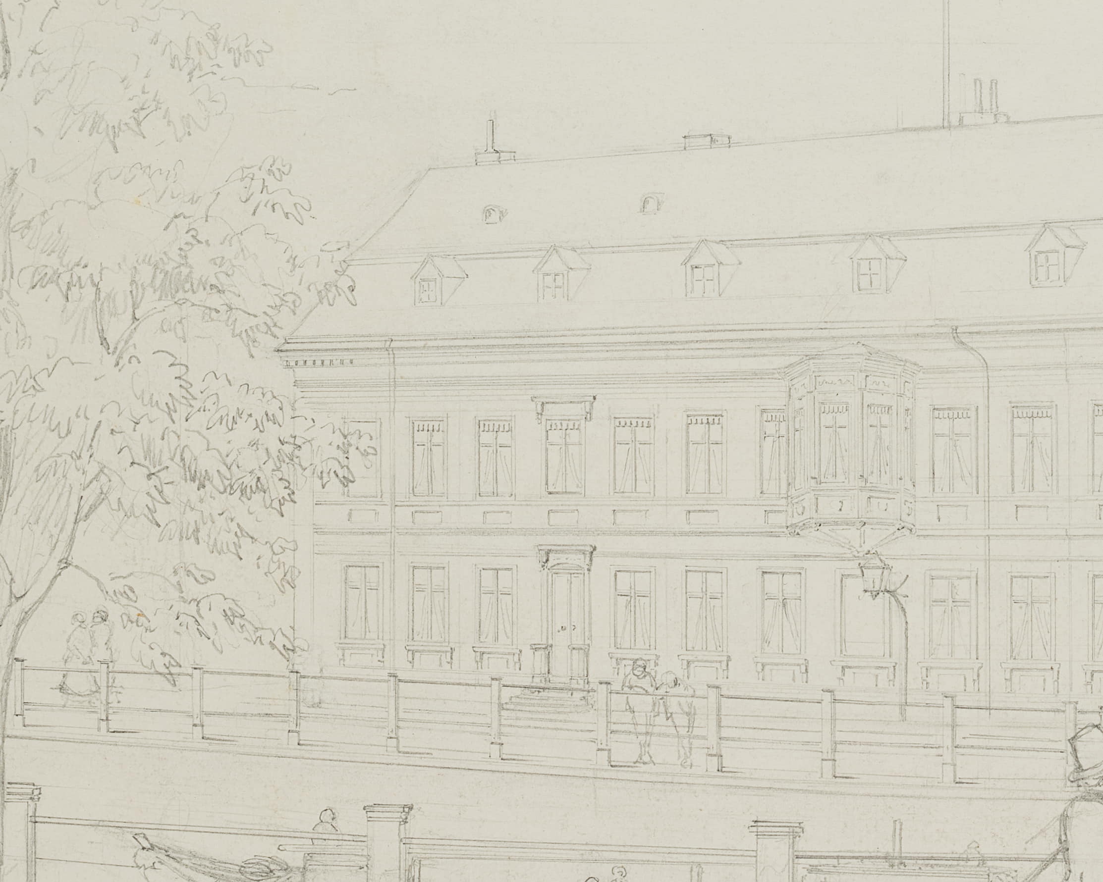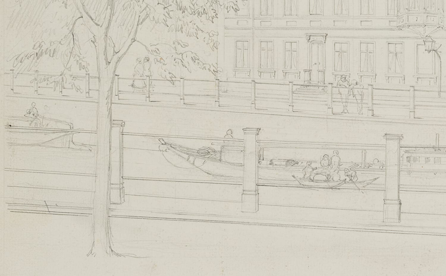 - Beschreibung: Am Geländer des Spreekanals in Berlin stehen zwei Herren mit Hut und Stock und blicken auf die gegenüberliegende Seite. Dort erhebt sich eine klassizistische Villa mit breiter Fassade und mittigem Erker. Auf dem Kanal sind einige Schiffer mit Booten unterwegs. Aus der Hand eines Berliner Künstlers stammt diese gekonnt aufgelockerte Architekturzeichnung, die sich durch hohe Präzision in den Details der Fassade sowie ungezwungene Leichtigkeit in den kleinen Genreszenen auszeichnet.