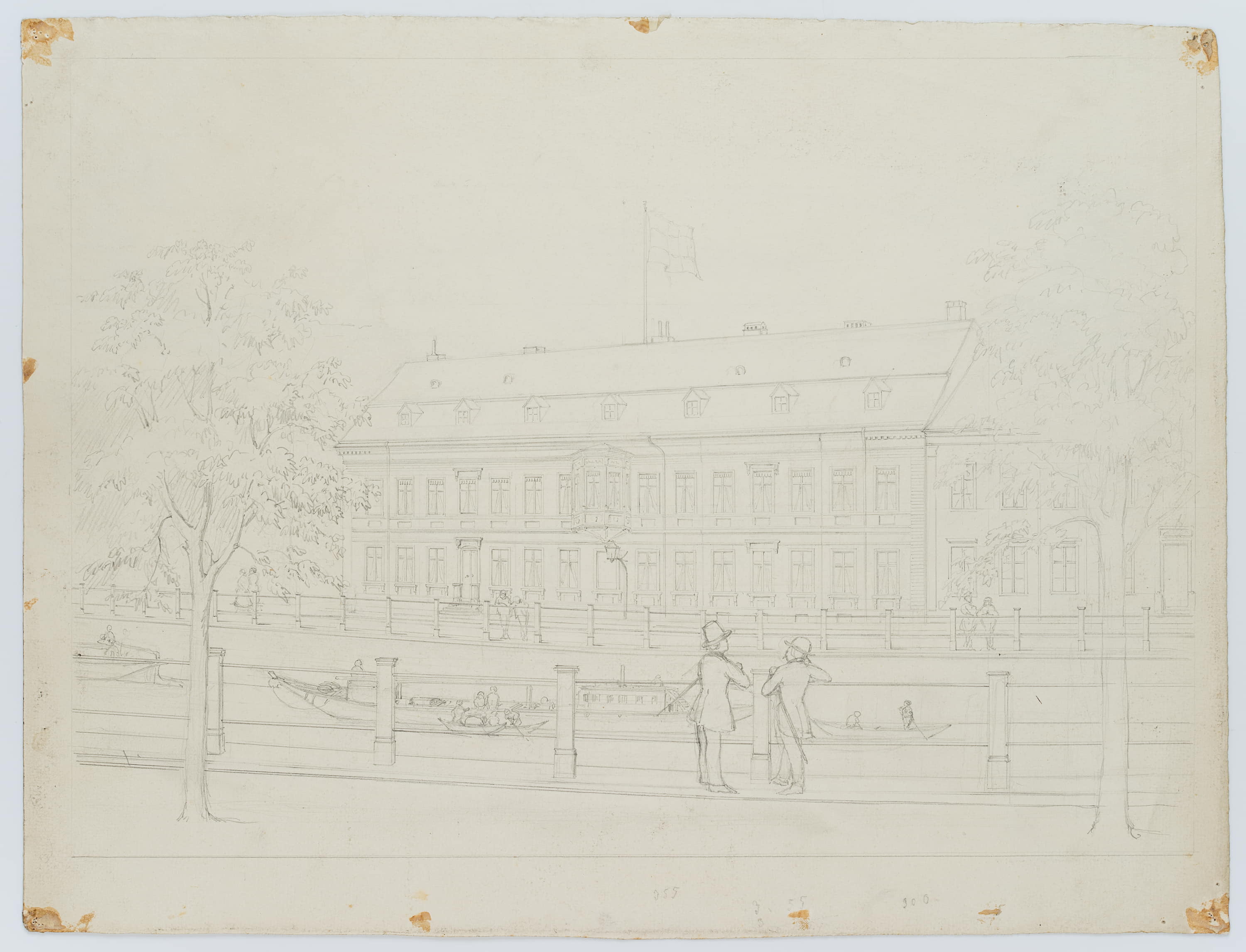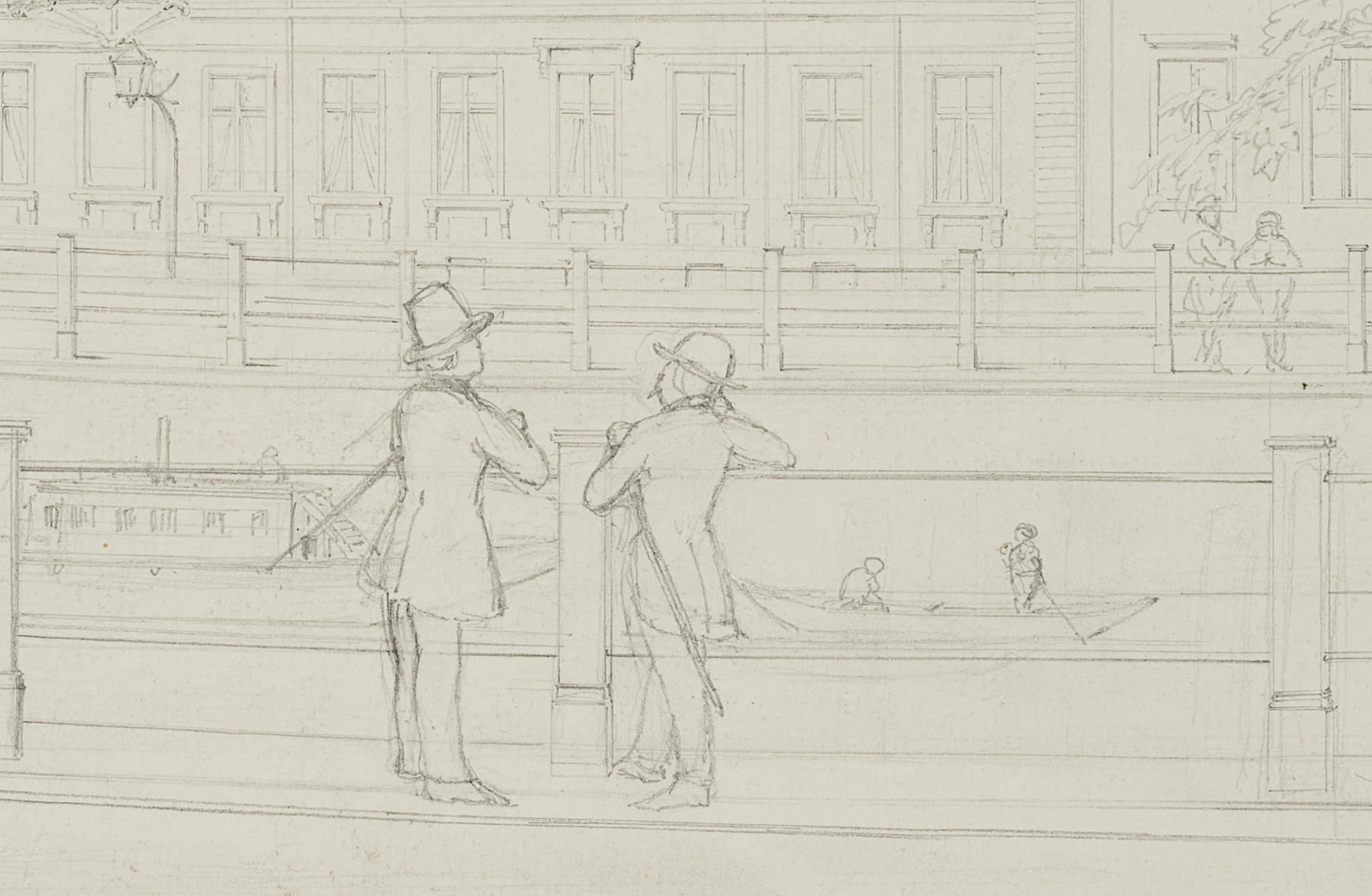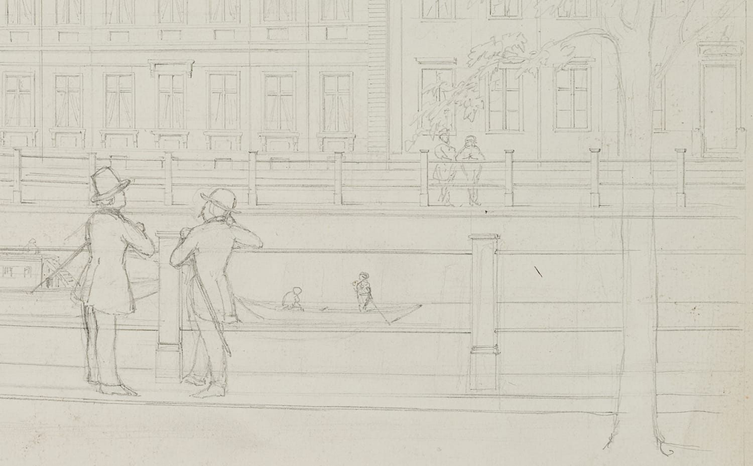 Unknown (19th century), Two gentlemen on the Spree Canal with villa architecture, c. 1860, Pencil
