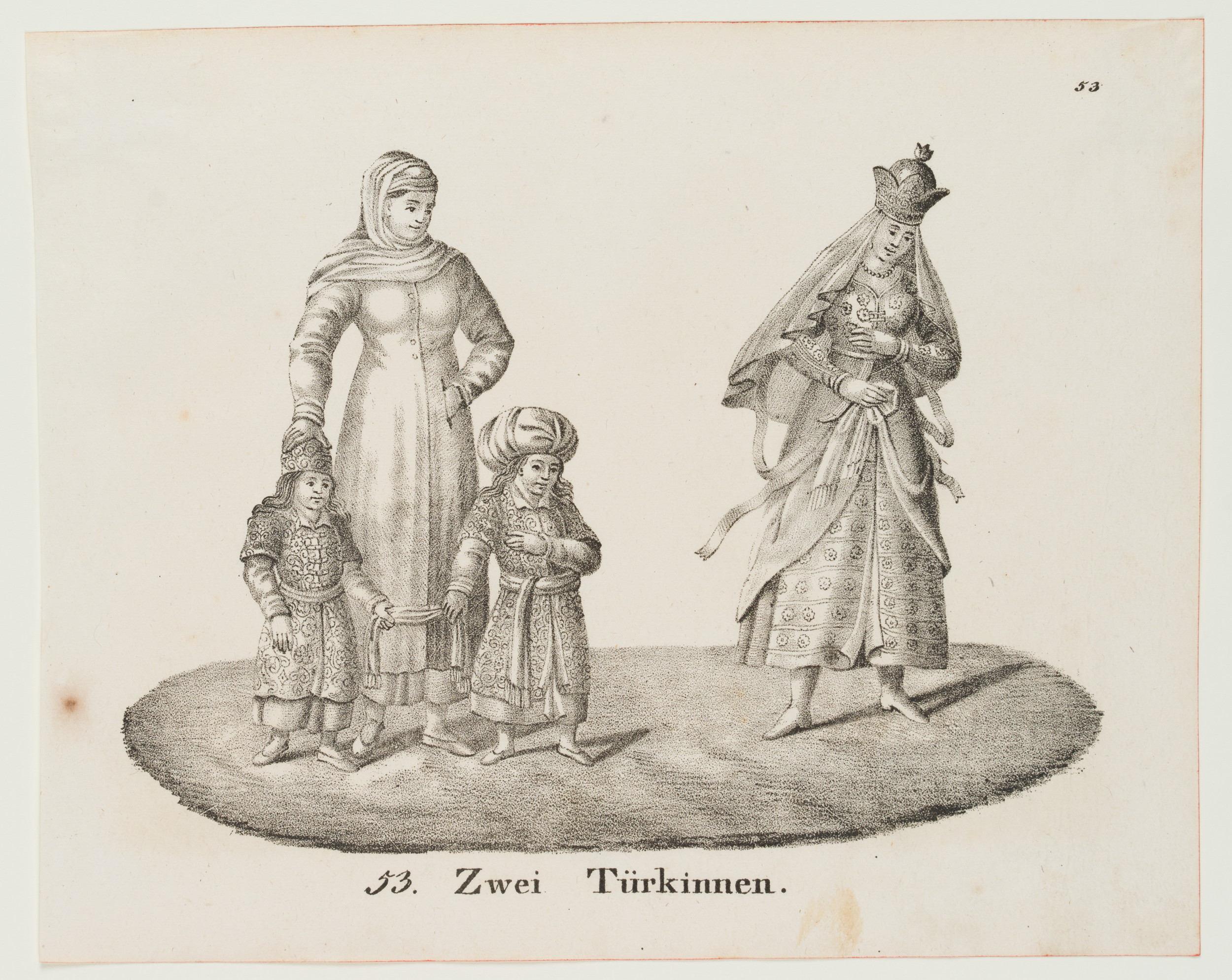 - Bezeichnung: Unten mittig im Druck bezeichnet: “53. Zwei Türkinnen.”. Oben rechts nummeriert: “53”.