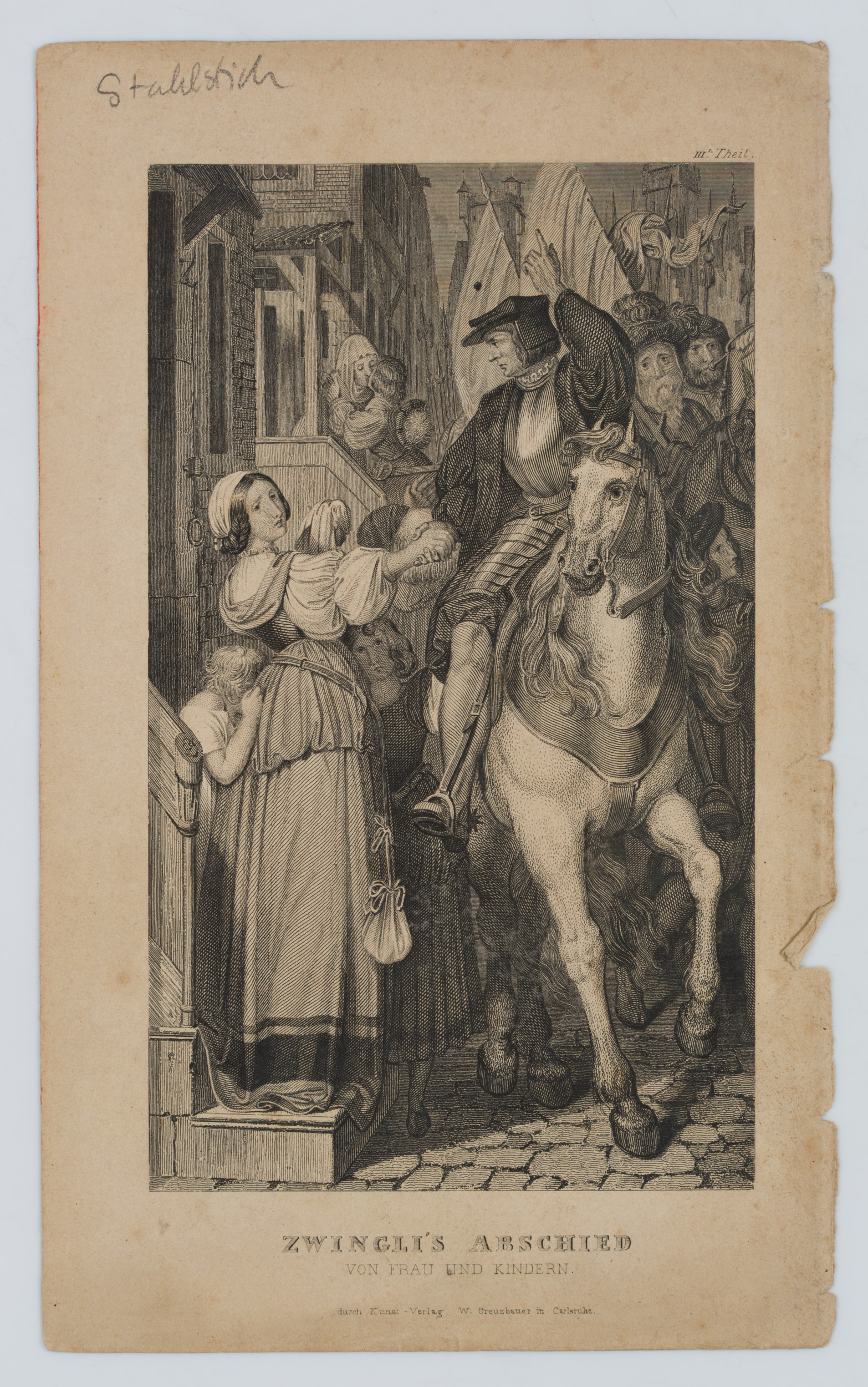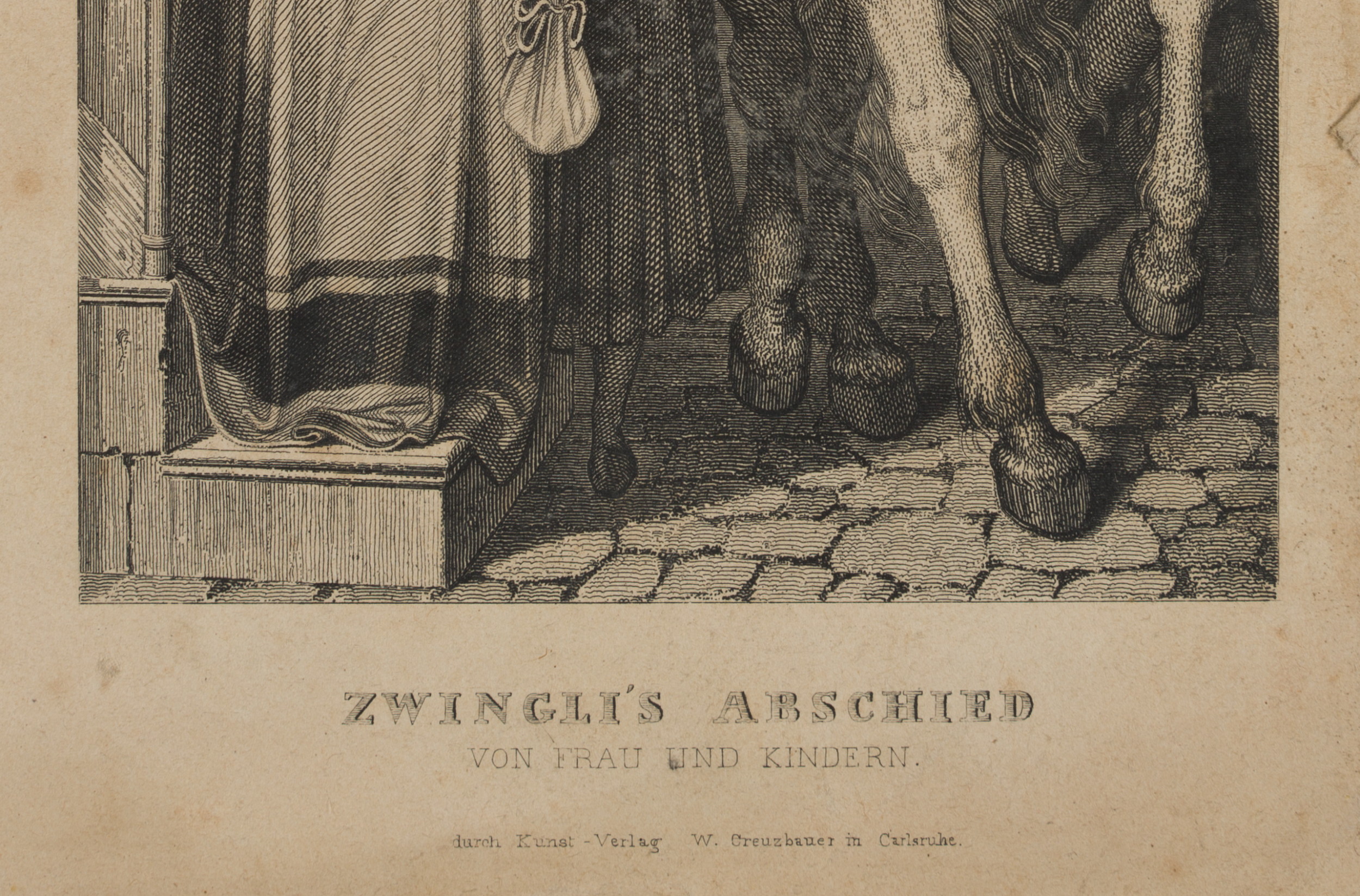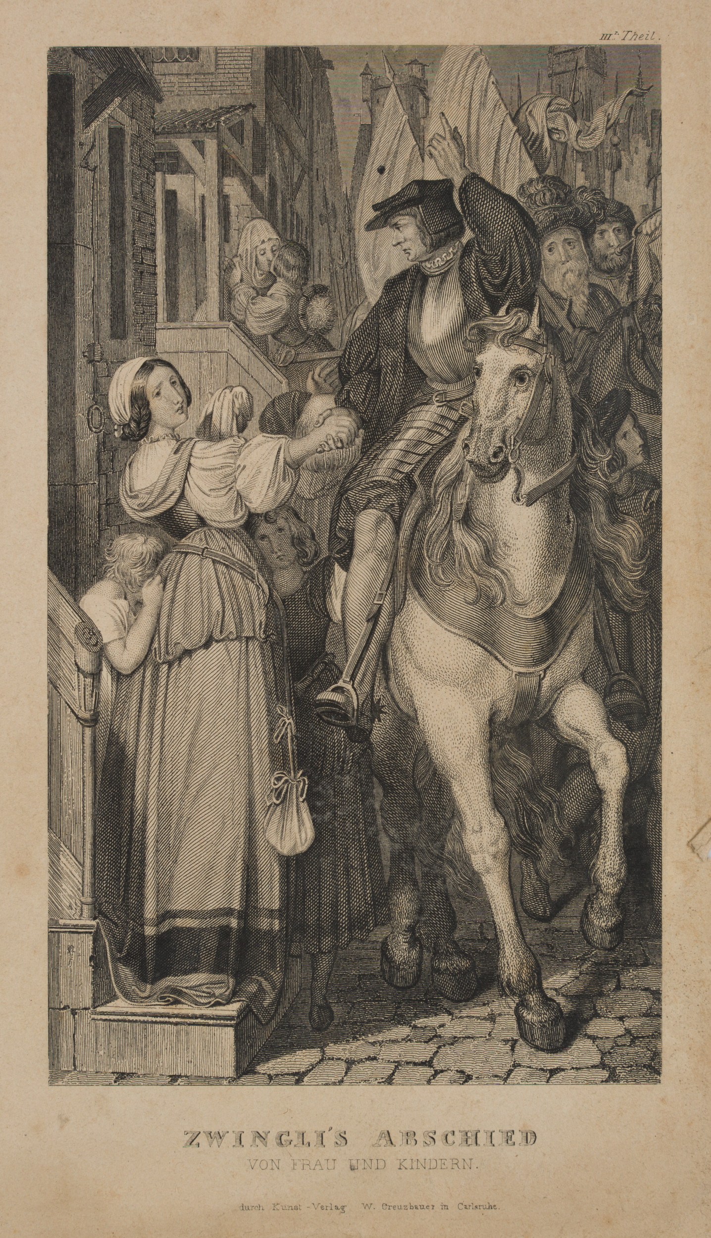 - Beschreibung: Darstellung des Schweizer Reformators Huldrych Zwingli zu Pferd, Abschied nehmend von seiner Frau und seinen Kindern.