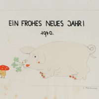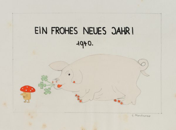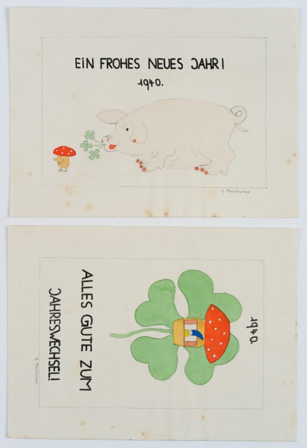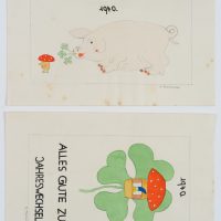 Unbekannt (20. Jahrhundert), 2 Neujahrskarten, mit Kleeblatt und Glücksschwein, 1940, Bleistift