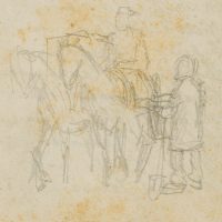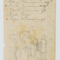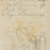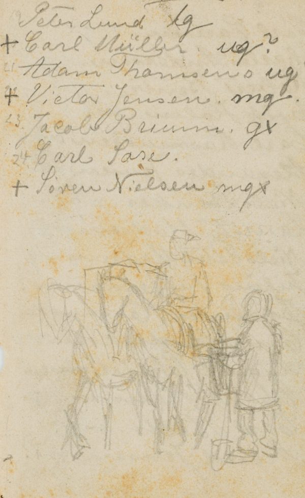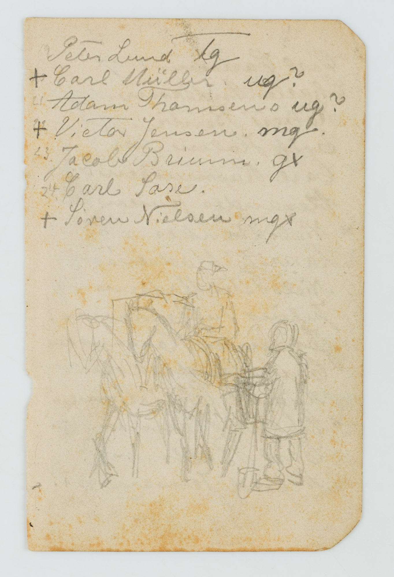 - Description: The sheet is inscribed on both sides with 23 artists’ names, including: Carl Rasmussen, August Christiansen, Sören Nielsen, Peter Lund, Carl Müller, Charles Andersen etc. Below the names a small pencil sketch with a rider on the move on two horses.