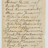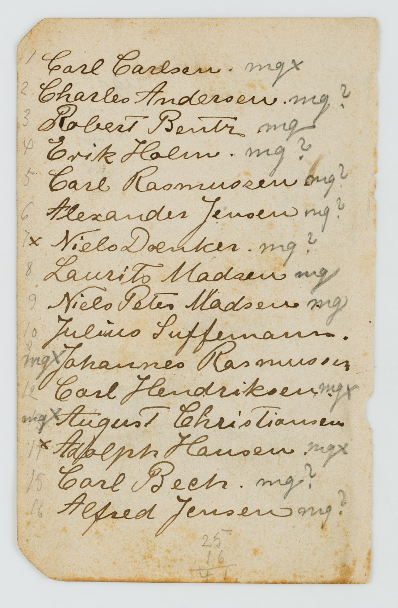- Beschreibung: Das Blatt ist beidseitig mit 23 Künstlernamen beschriftet, darunter: Carl Rasmussen, August Christiansen, Sören Nielsen, Peter Lund, Carl Müller, Charles Andersen etc. Unter den Namen eine kleine Bleistiftskizze mit einem Reiter unterwegs auf zwei Pferden.