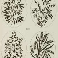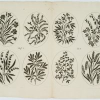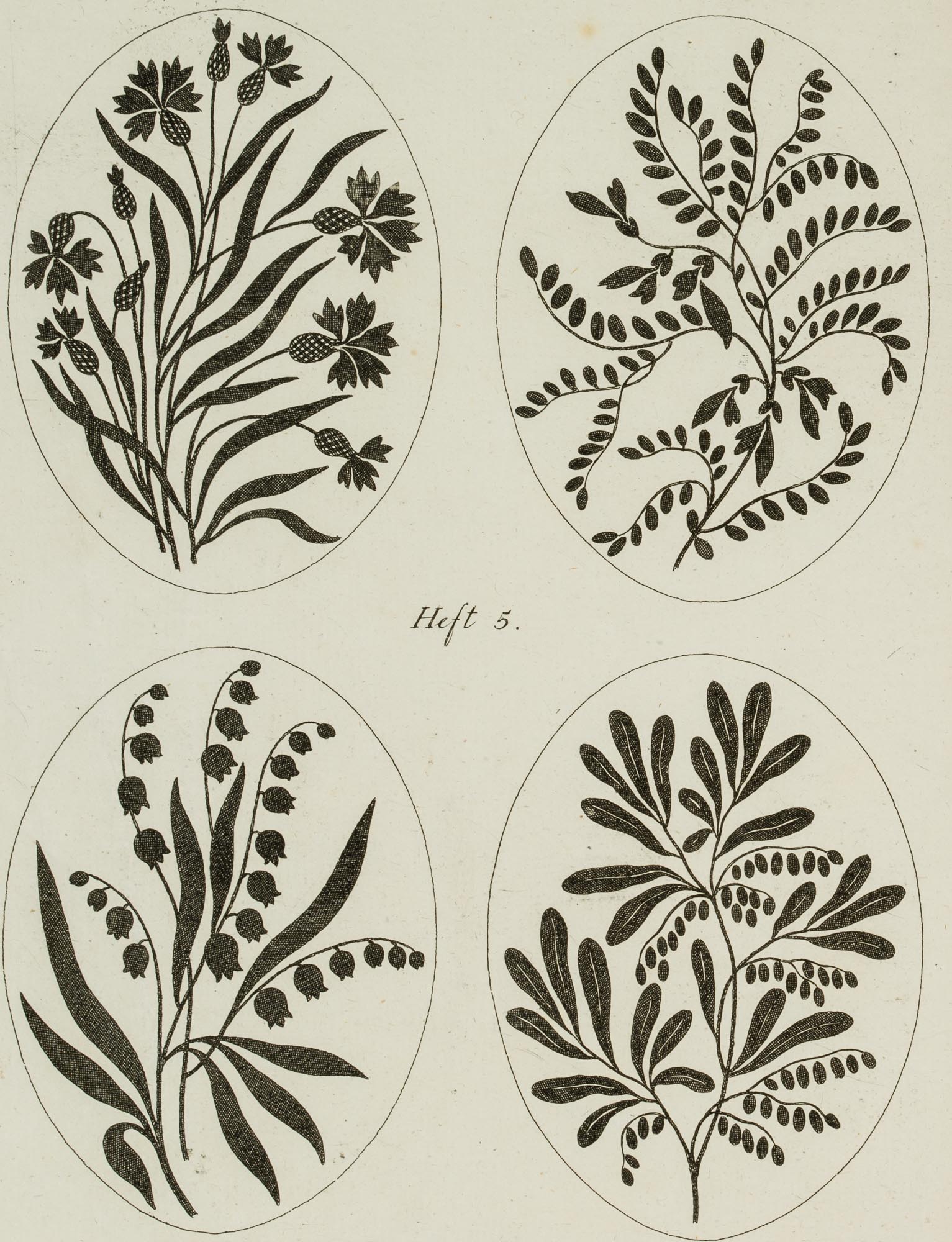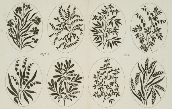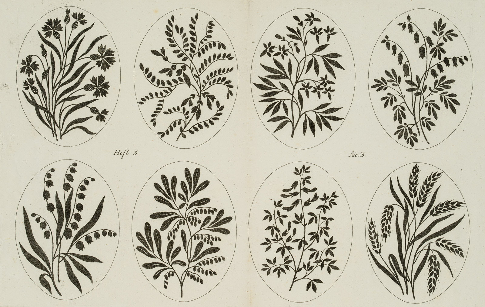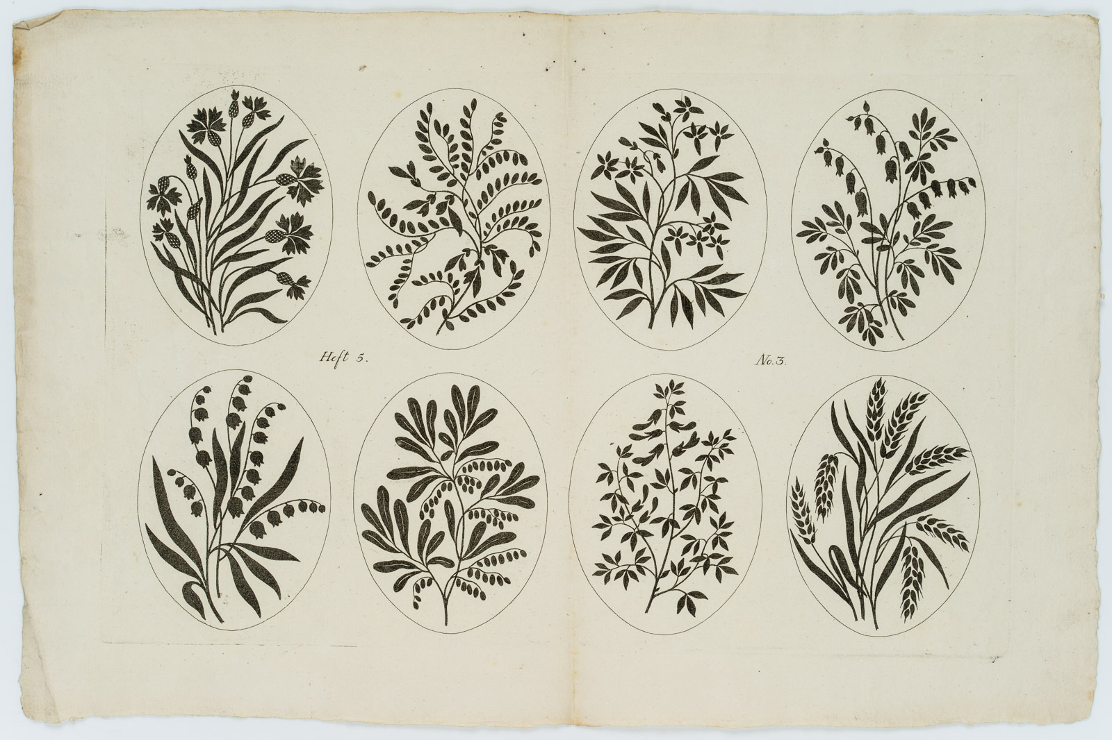 • Beschreibung: Innerhalb der Darstellung bezeichnet mit “Heft 5. / No. 3”. Acht schöne Pflanzendarstellungen im Oval, zu sehen sind unter anderem Maiglöckchen, Glockenblumen und unbegranntem Weizen. | Wasserzeichen: Krone