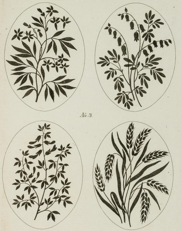 Innerhalb der Darstellung bezeichnet mit “Heft 5. / No. 3”. Acht schöne Pflanzendarstellungen im Oval, zu sehen sind unter anderem Maiglöckchen, Glockenblumen und unbegranntem Weizen. | Wasserzeichen: Krone