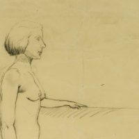 - Beschreibung: Im Hochformat der Darstellung erblicken die Betrachtenden eine aufrecht stehende Frau. Die Unbekleidete hat ihren rechten Arm auf einem Vorsprung abgelegt, sie steht im leichten Kontrapost. Konzentriert blickt die Dargestellte aus dem rechten Bildraum hinaus und entgeht auf diese Weise den Blicken der Betrachtenden.