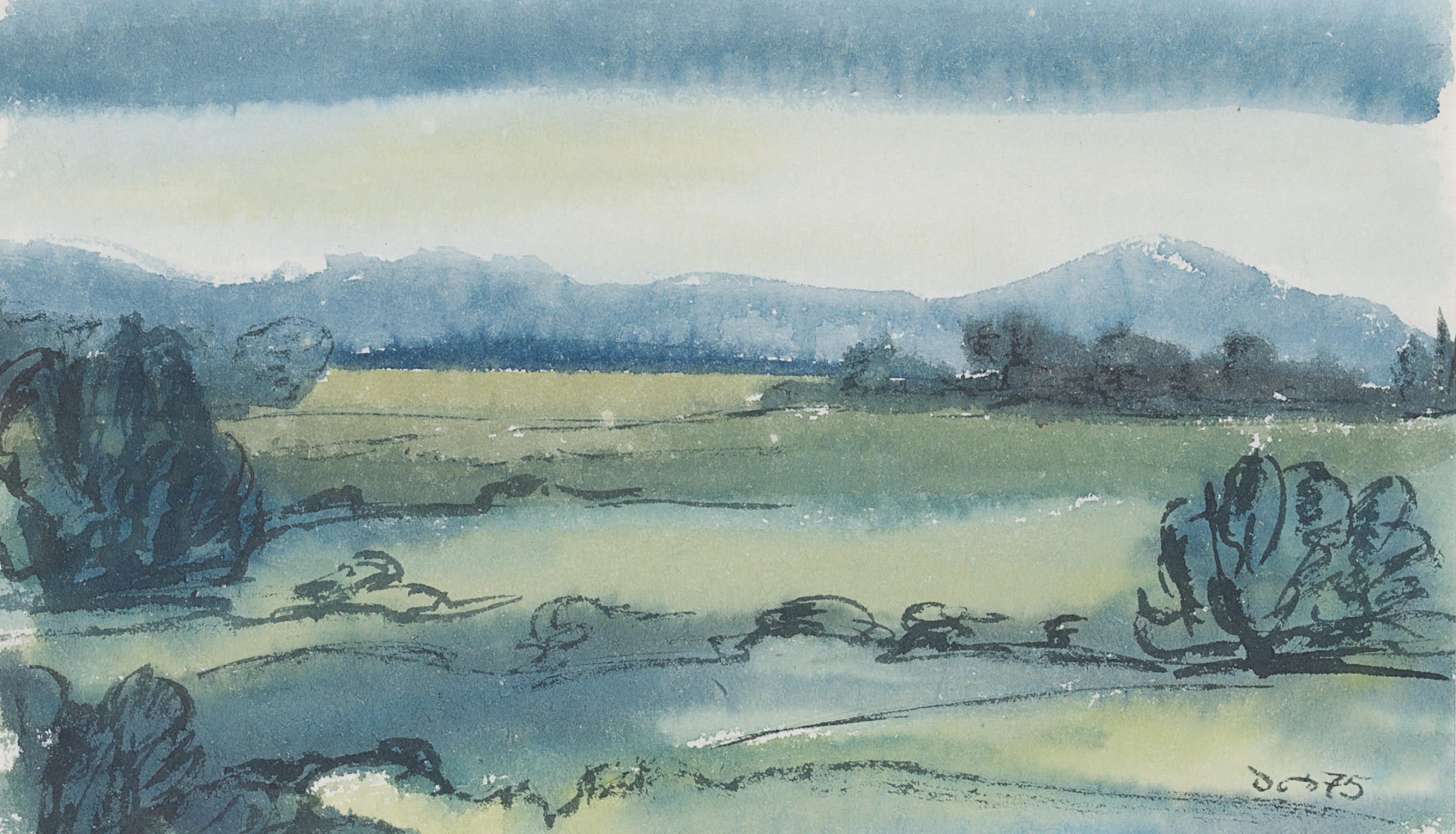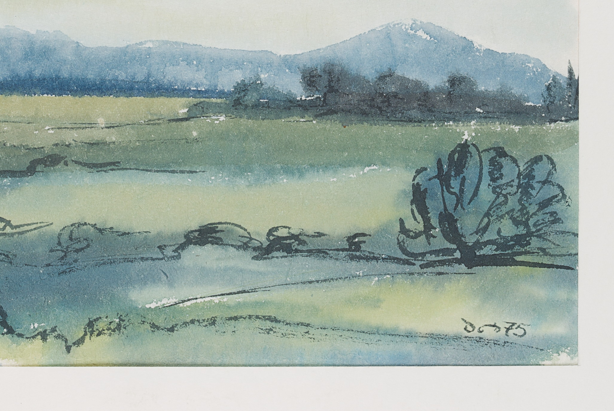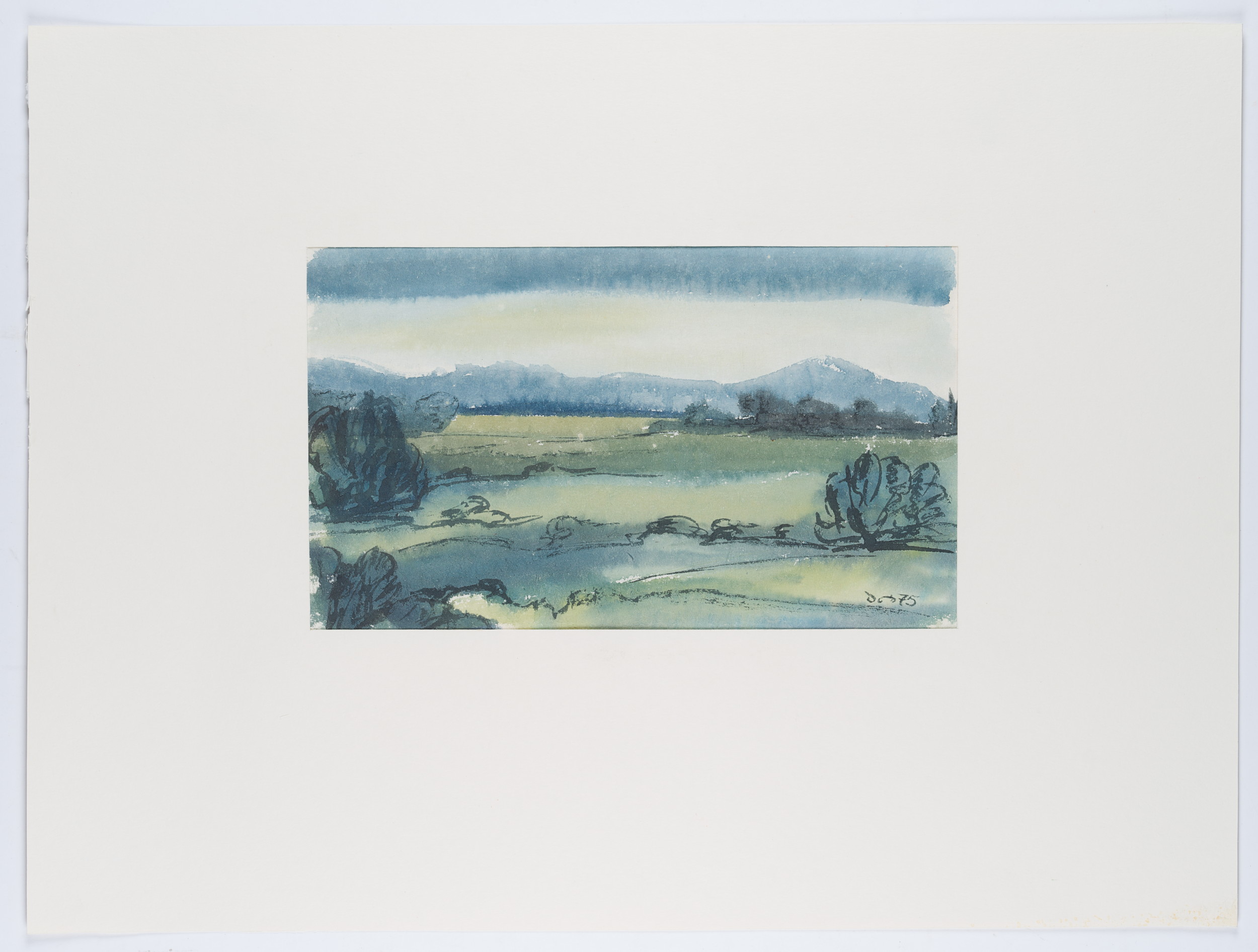 Unknown (20th century), American landscape, prairie with distant hill range, 1975, Watercolor