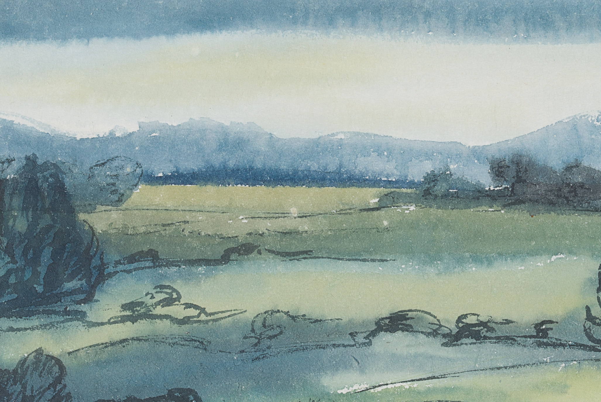 - Description: Fine watercolour with glazed colours. Showing an American prairie landscape with staggered pictorial space.