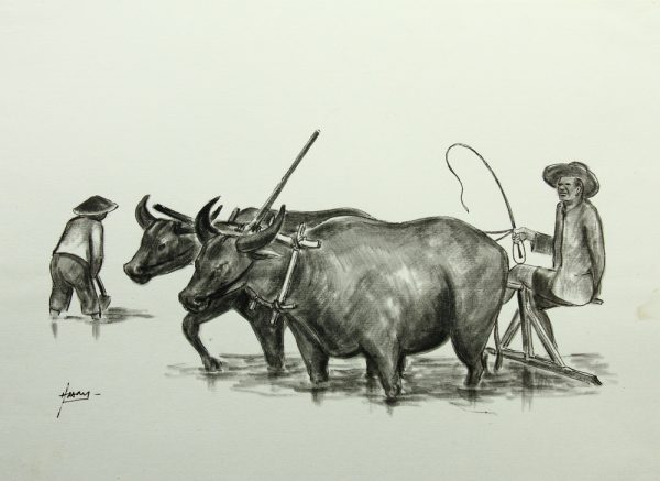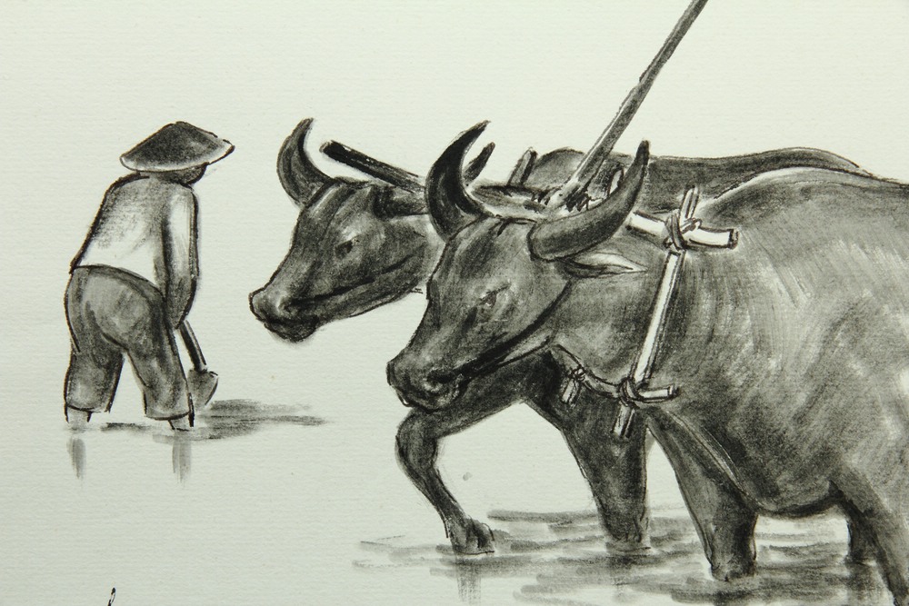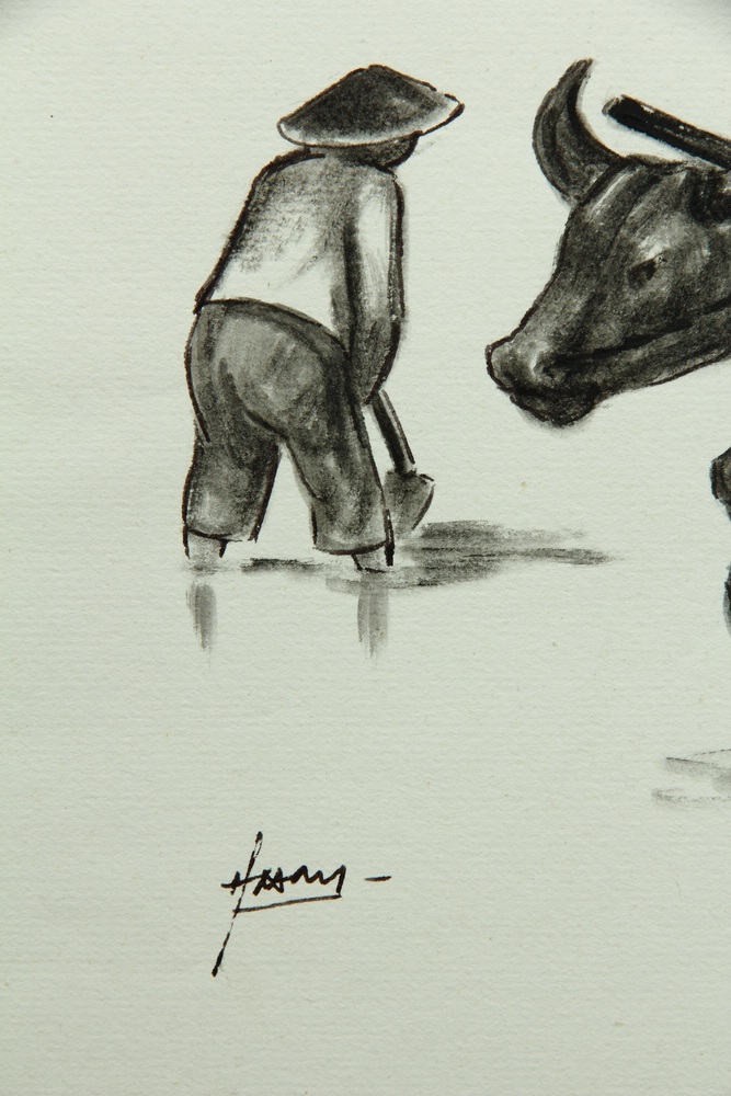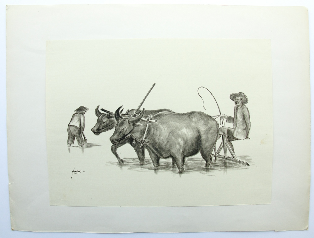 Unbekannt (20. Jahrhundert), Asiatische Reisbauern beim Pflügen mit Wasserbüffeln, , Pinselzeichnung