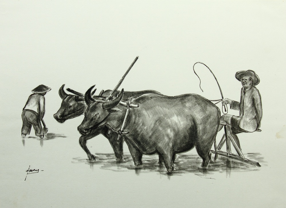 - Description: Full-length depiction of a plough pulled by water buffaloes with a farmer sitting on it.
