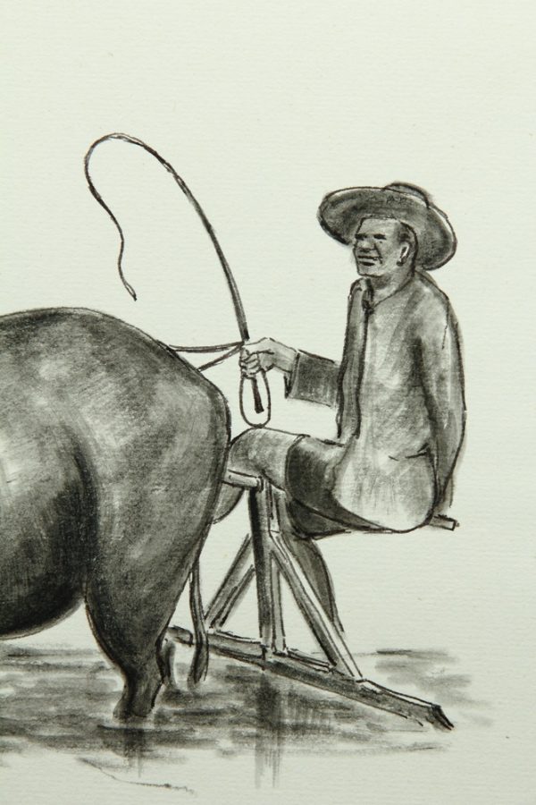 - Beschreibung: Ganzfigurige Darstellung eines von Wasserbüffeln gezogenen Pfluges mit aufsitzendem Bauern.