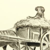 - Description: mounted on strong paper Full-length depiction of a single-axle horse-drawn carriage. In the foreground a passer-by is seen from the back.