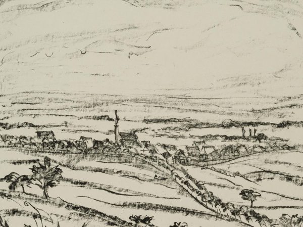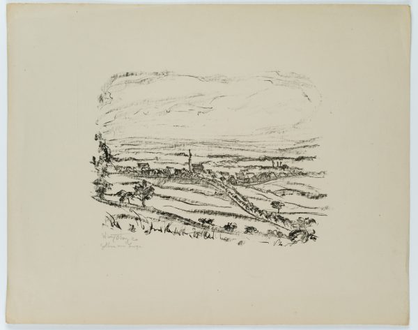 Unbekannt (20. Jahrhundert), Ausblick auf weite flache Landschaft mit Siedlung in der Ferne und der Silhouette eines Kirchturms, 1920, Lithographie