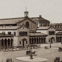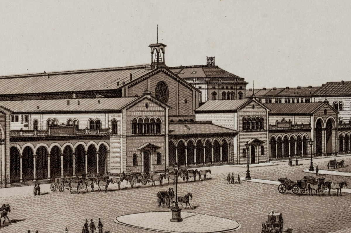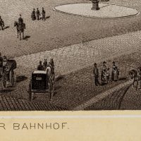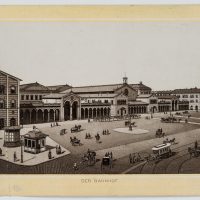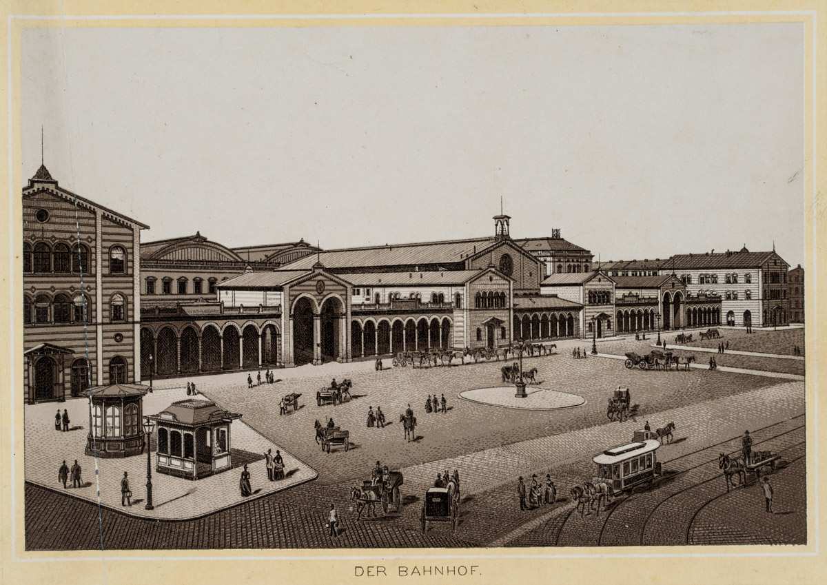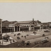 Unknown (20th century), Railway station and forecourt in Munich, c. 1900, Lithography