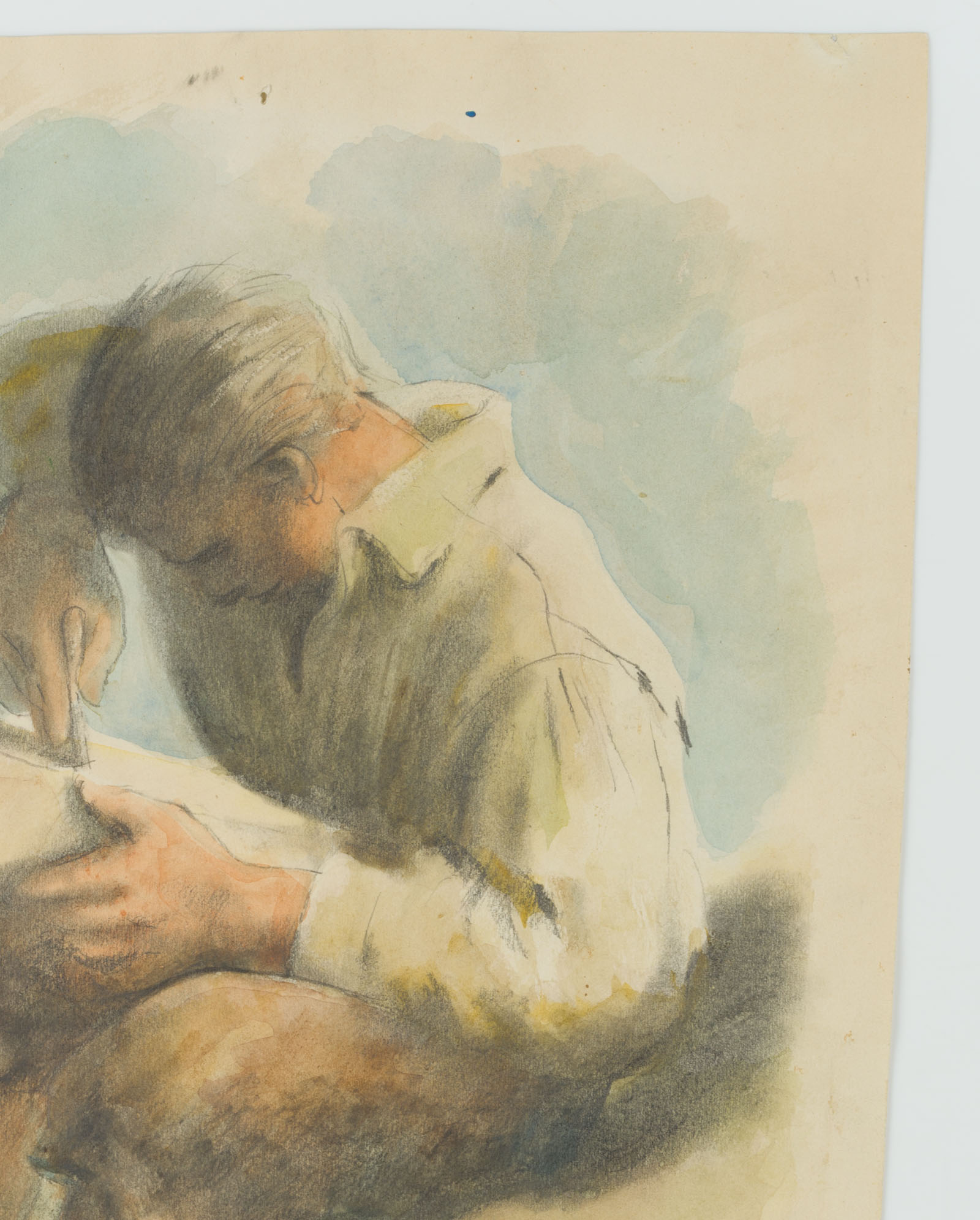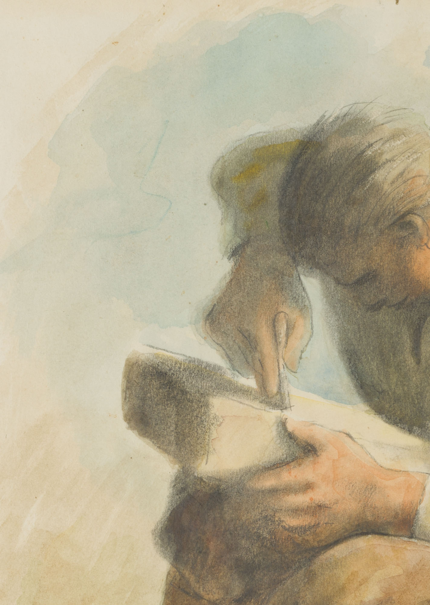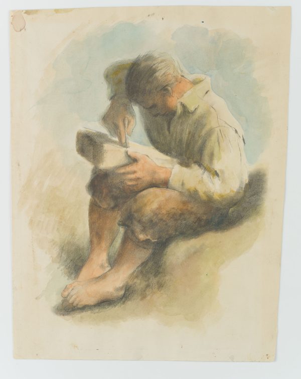 Unbekannt (20. Jahrhundert), Beim Holzschnitzen, , Aquarell