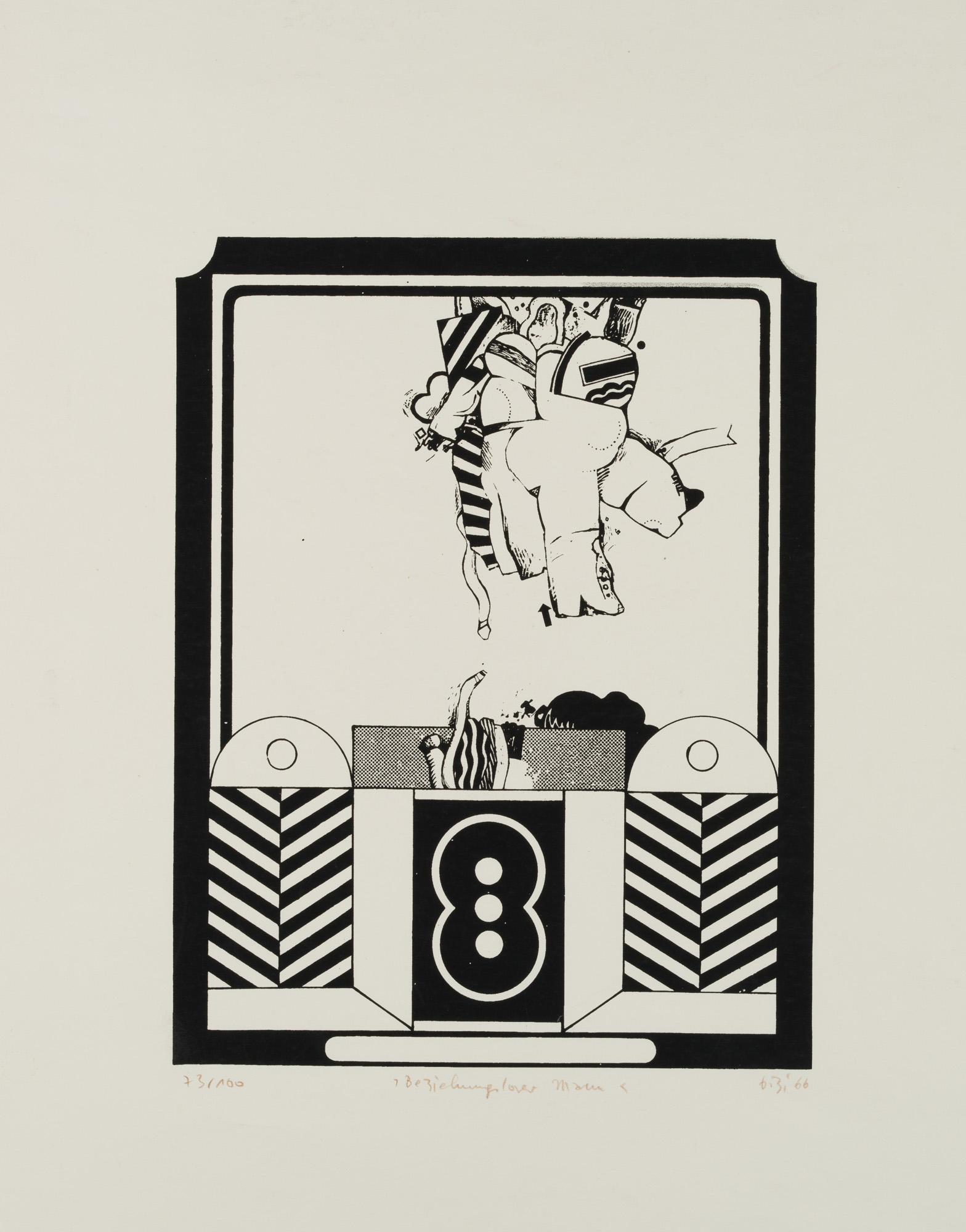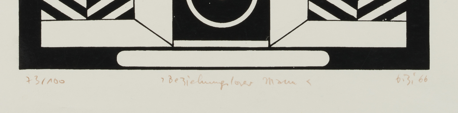 Unter der Darstellung signiert, datiert und mit Auflage “73/100 / Beziehungsloser Mann / Bibi(?) 66”