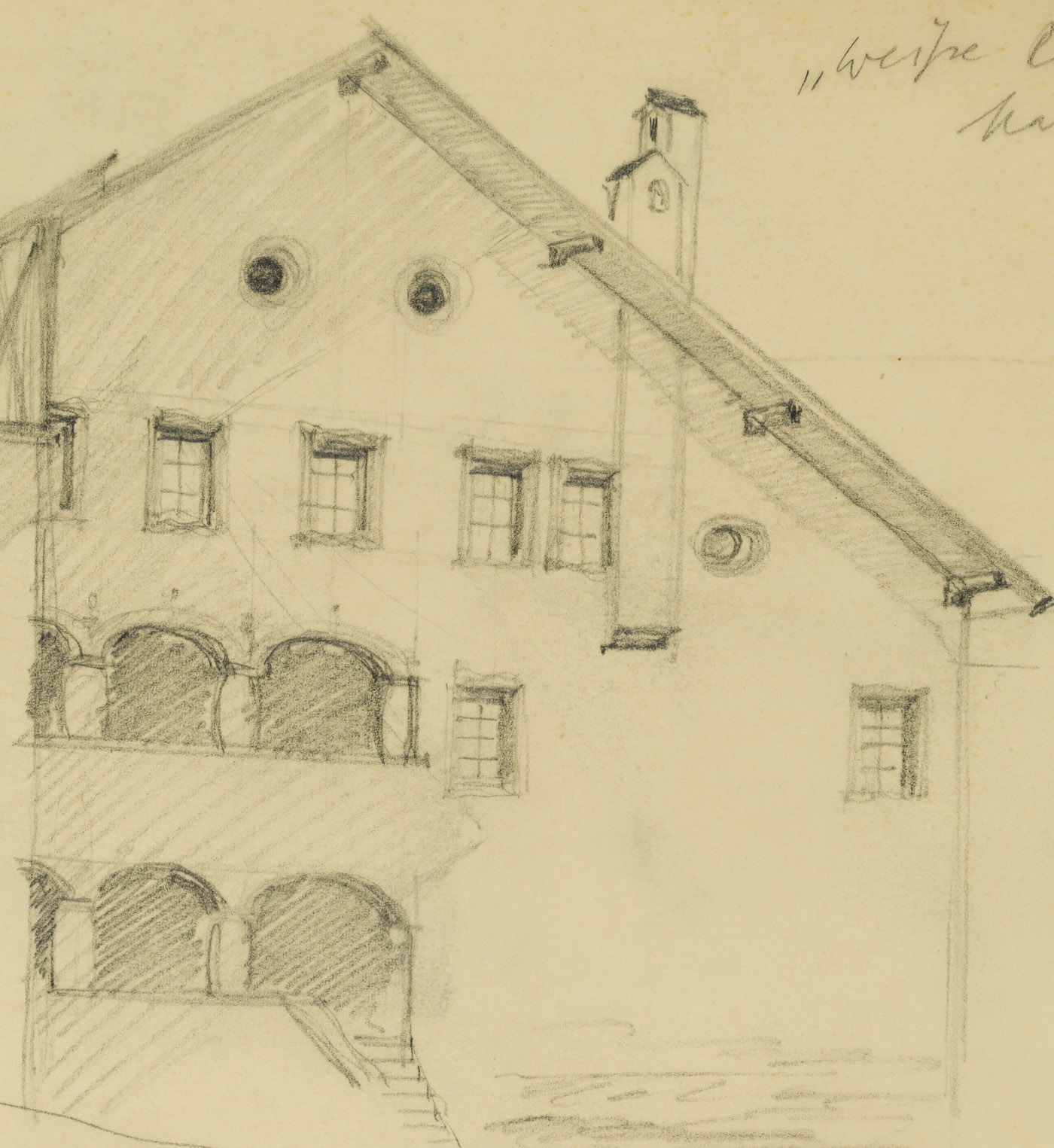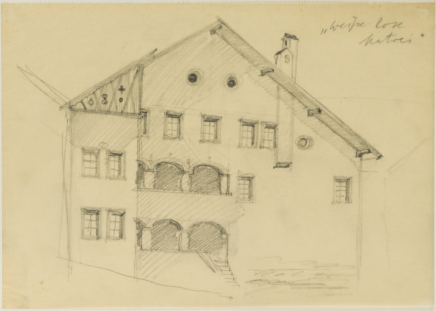 • Description: View of the façade of the “Weiße Rose” inn in the market town of Matrei in Tyrol. It is dominated by arcades with wooden carvings in the gable field of the extension on the left. The artist attentively captured every detail of the rural architecture.