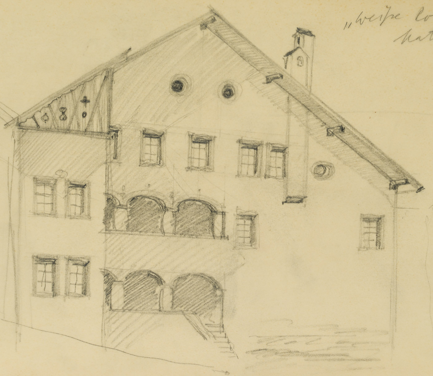 Blick auf die Fassade des Gasthofs “Weiße Rose” in der Marktgemeinde Matrei in Tirol. Diese wird von Laubengängen mit Arkaden dominiert, links im Giebelfeld des Anbaus ist hölzernes Schnitzwerk zu erkennen. Aufmerksam erfasste der Künstler ein jedes Detail der bäuerlichen Architektur.