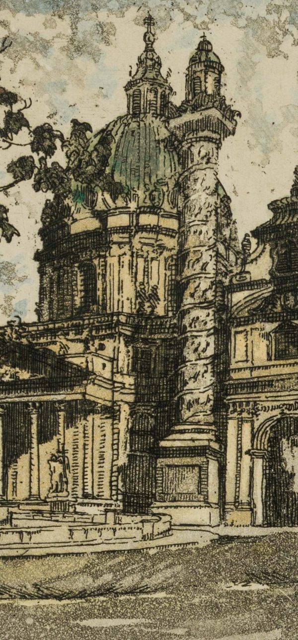 - Description: Inscribed below the image (illegible). View of the imposing Charles Church in Vienna from the 18th century. Commissioned by Emperor Charles VI, it was designed by Johann Bernhard Fischer von Erlach as a central link between Rome and Byzantium. Thus, it borrows from the appearance of the Hagia Sophia and imitates Trajan’s Column.