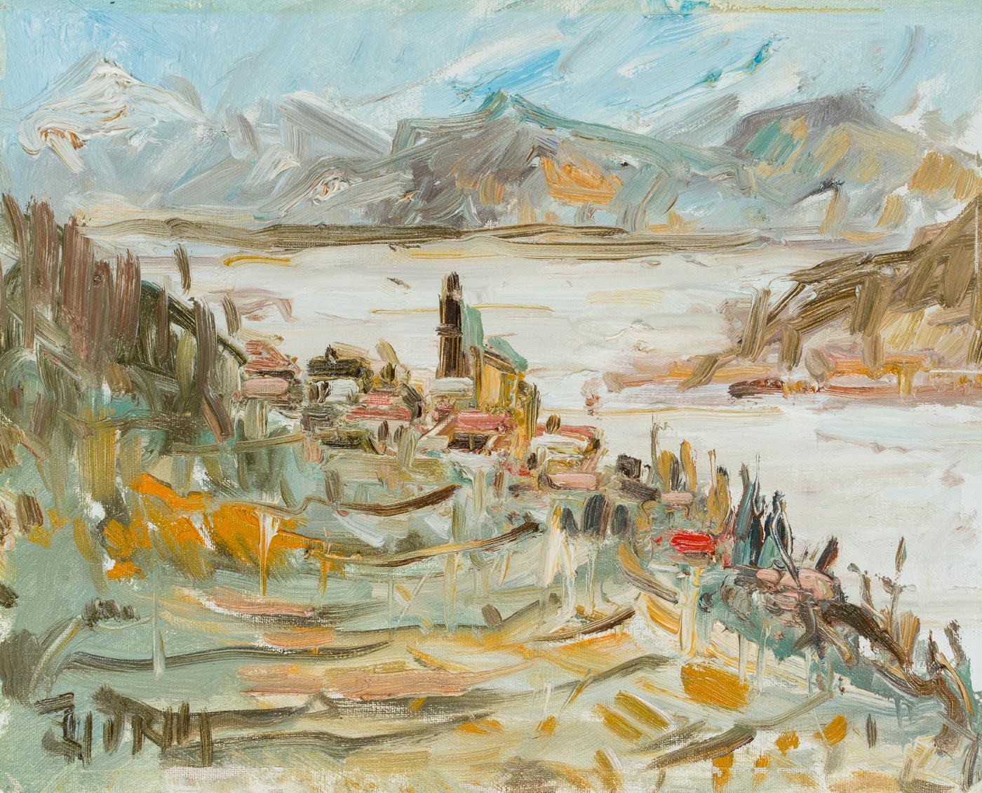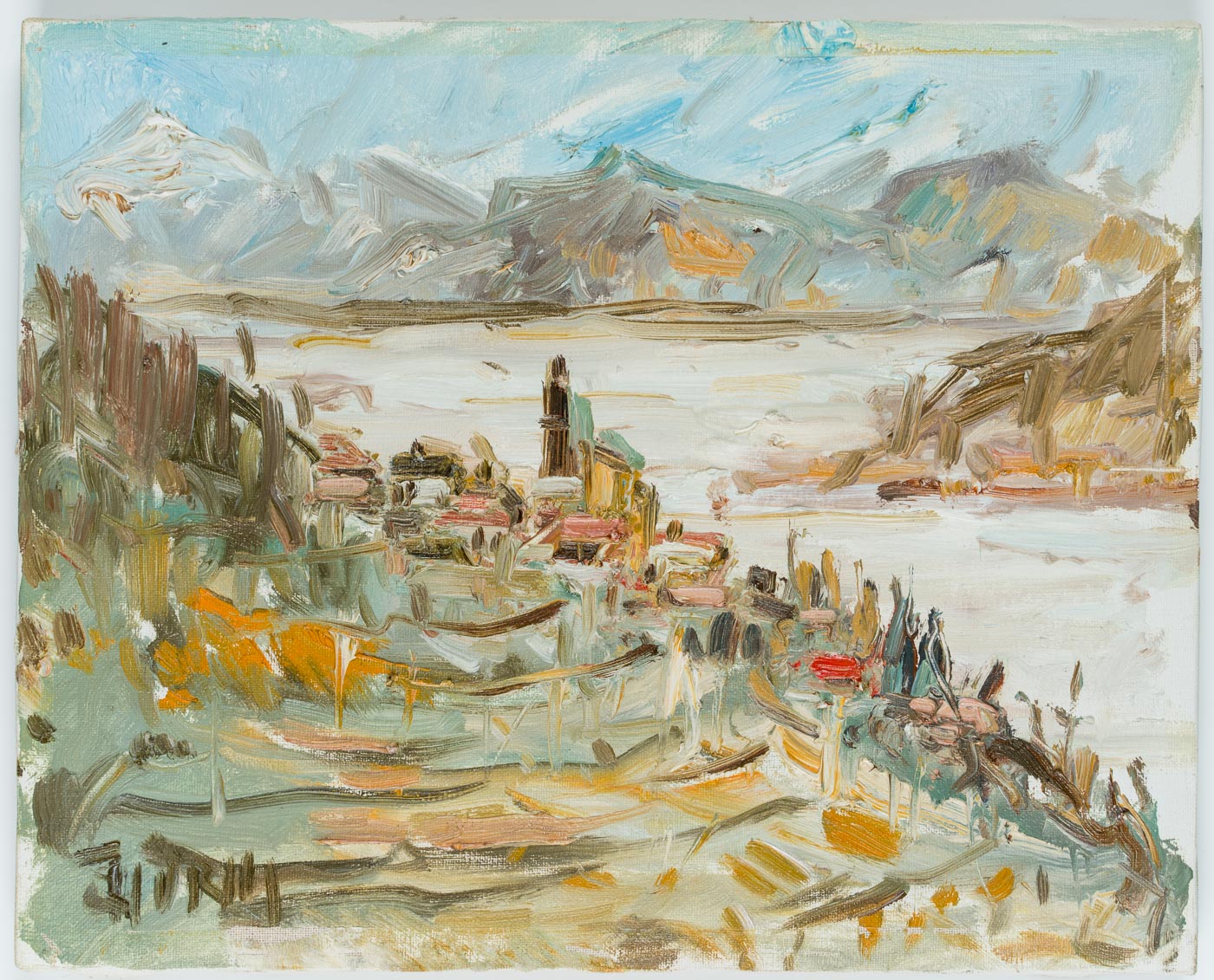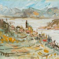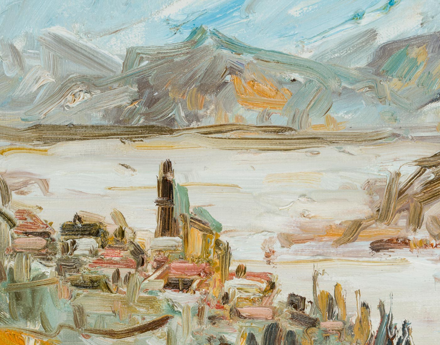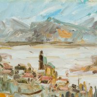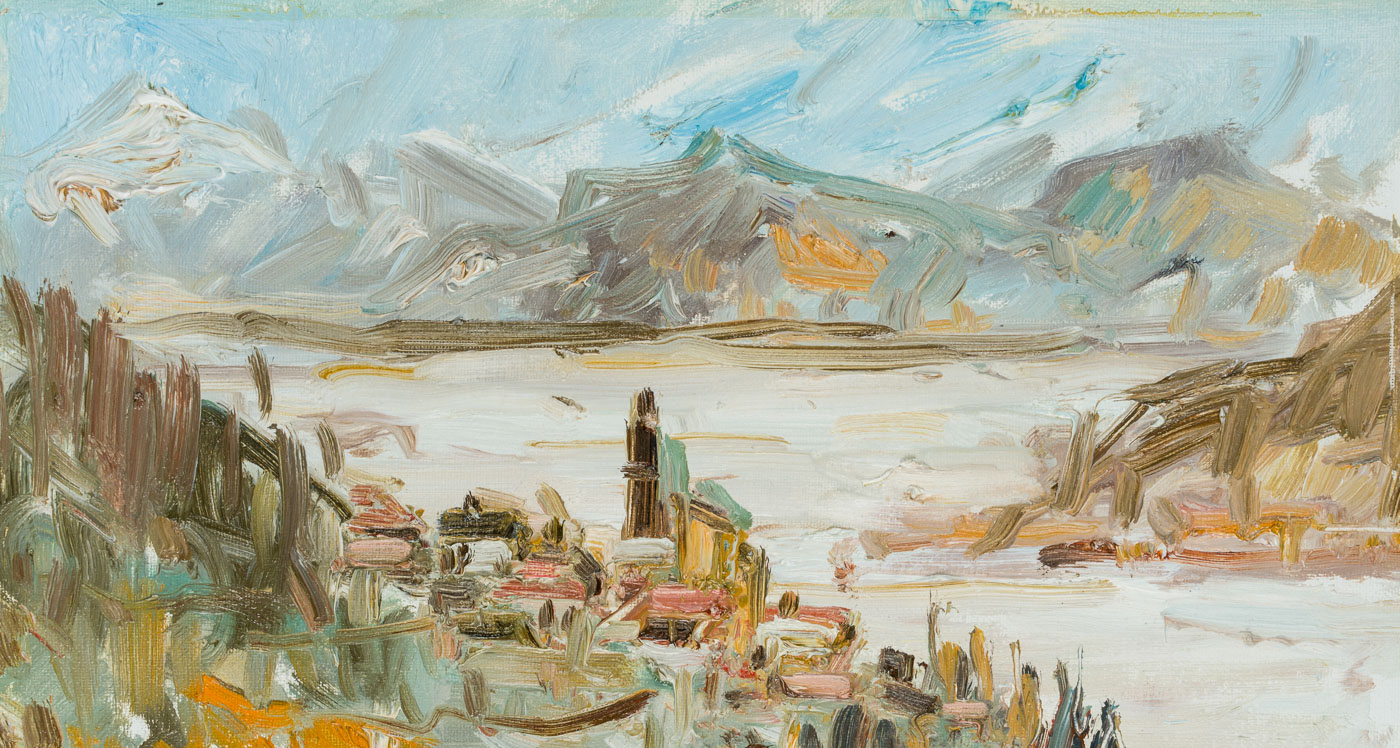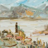 View of the picturesque village of Olevano stretching along the slopes of Monte Celeste. The roofs of the village’s houses and especially the church tower can be seen and have been brought onto the canvas with impasto brushstrokes. The view above the village then also allows a wide view of the valley of the Sacco and the Monti Lepini opposite. Especially in the 19th century, Olevano was the destination of numerous artists who saw in the village the epitome of their longing for Italy. During the hot summer months, they retreated here, among other places. To this day, artists seek out this place to make sketches and oil studies after nature.