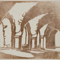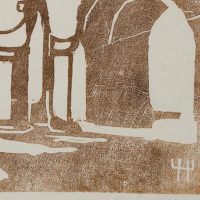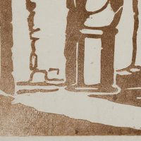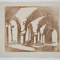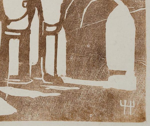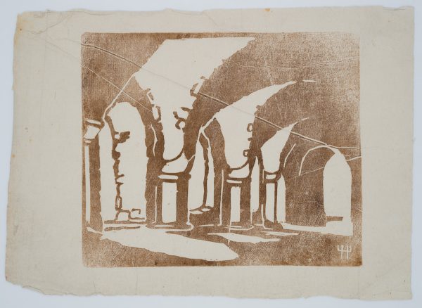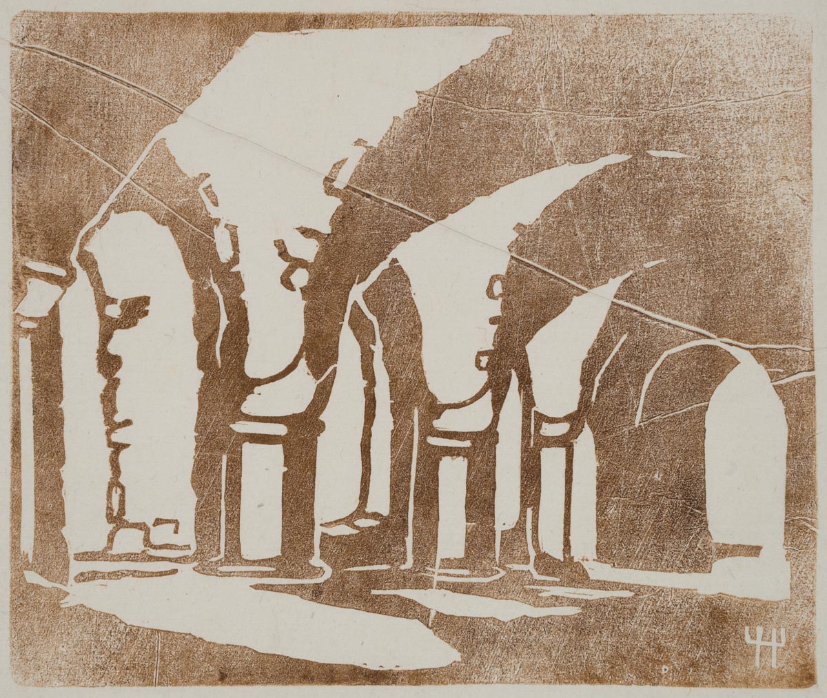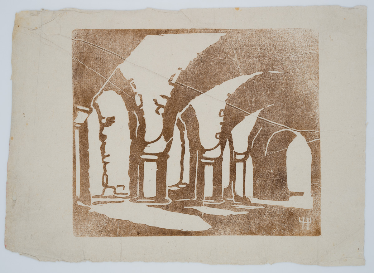 Unbekannt (20. Jahrhundert), Blick in eine Krypta, um 1910, Linolschnitt